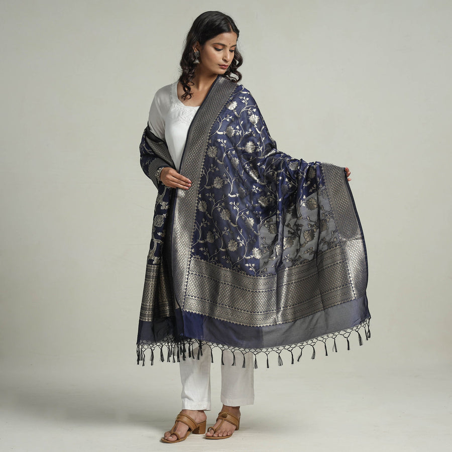 Blue - Banarasi Semi Silk Zari Jaal Dupatta with Tassels 26