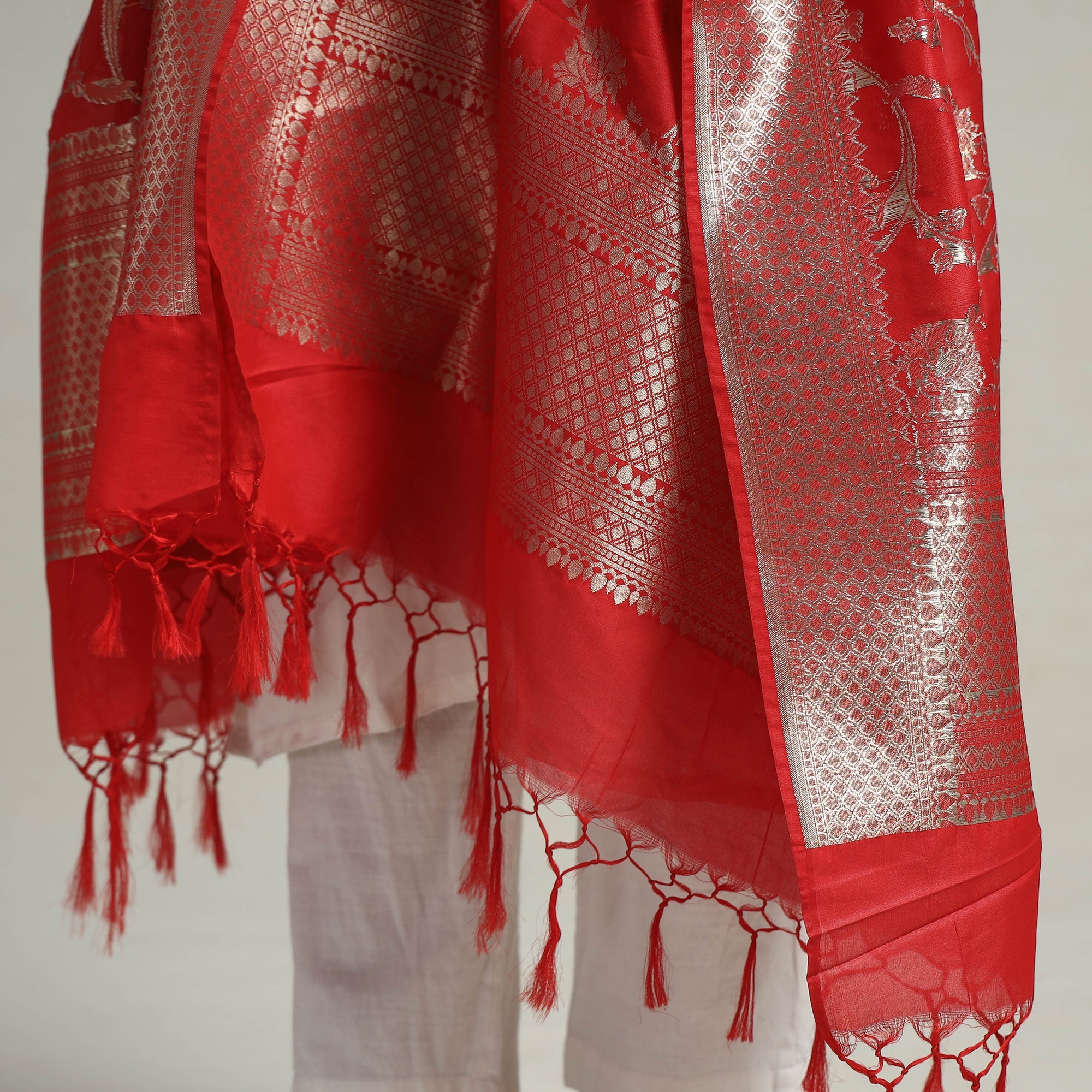 This exquisite banarasi semi silk zari jaal dupatta with tassels is a stunning addition to your wardrobe. The intricate floral zari jaal pattern adds a touch of elegance and grace to the rich dupatta. Adorned with delicate tassels, this dupatta is the perfect accessory to elevate your traditional attire. Its lightweight and semi-silk texture ensure comfort while exuding a regal charm. With its blend of traditional and contemporary style, this dupatta is a must-have accessory for a glamorous look.