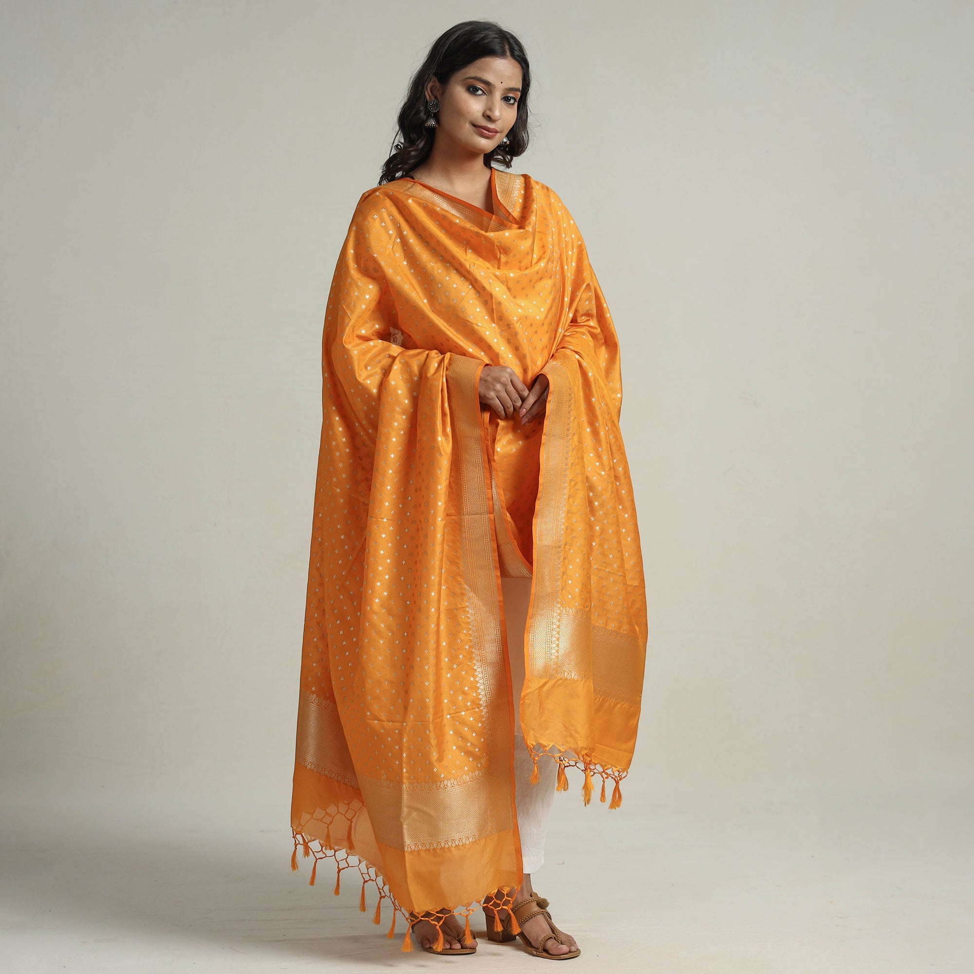 This exquisite banarasi semi silk zari jaal dupatta with tassels is a stunning addition to your wardrobe. The intricate floral zari jaal pattern adds a touch of elegance and grace to the rich dupatta. Adorned with delicate tassels, this dupatta is the perfect accessory to elevate your traditional attire. Its lightweight and semi-silk texture ensure comfort while exuding a regal charm. With its blend of traditional and contemporary style, this dupatta is a must-have accessory for a glamorous look.