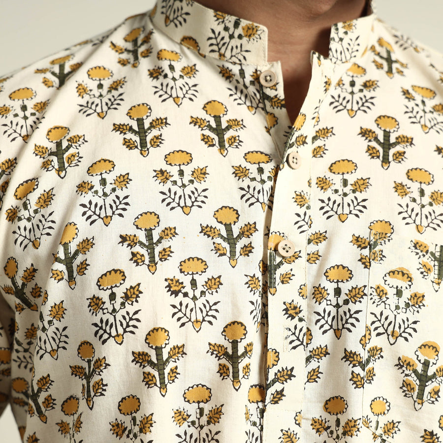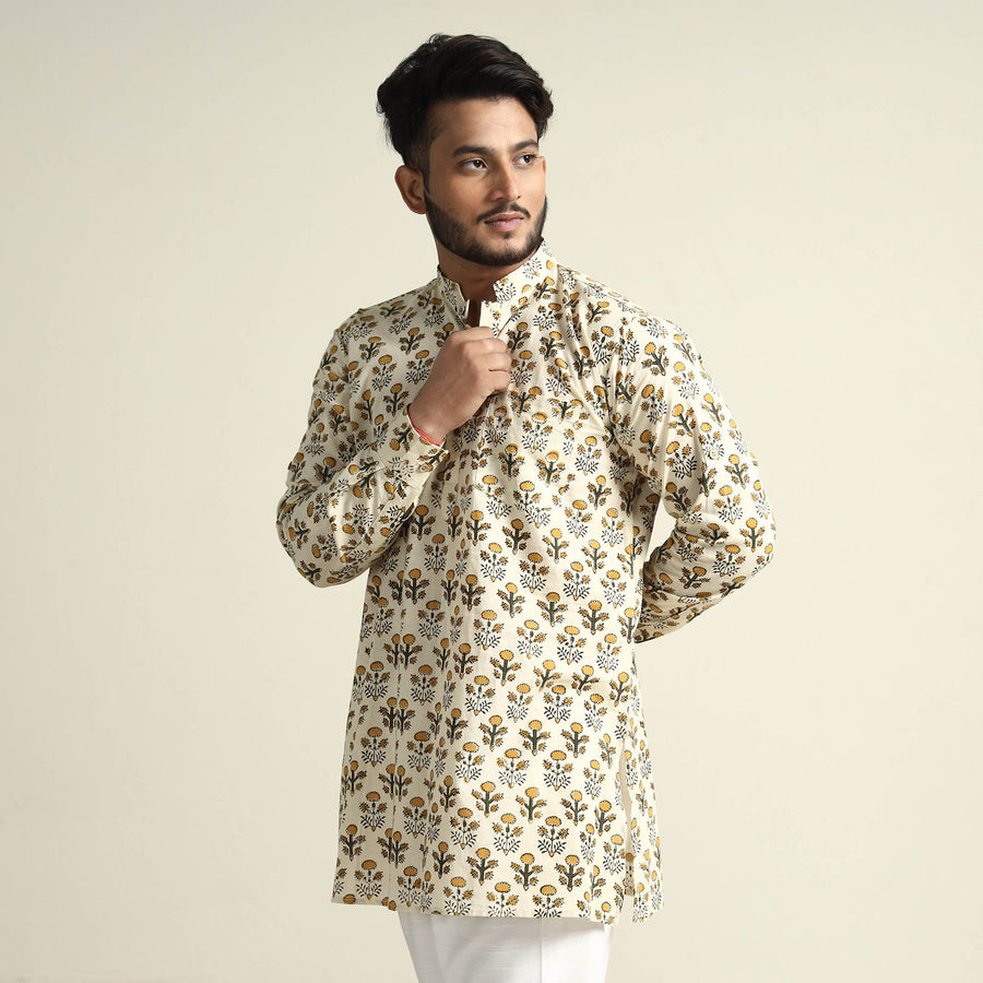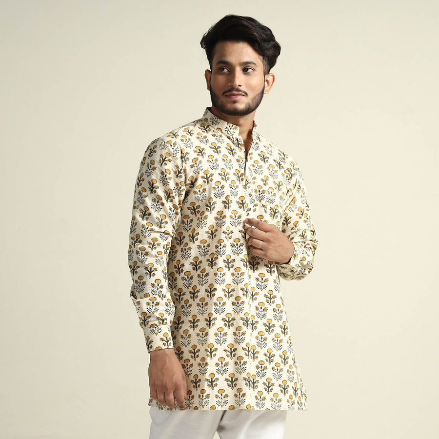 Bagru block printed cotton men's short kurta with one chest pocket, makes you comfortable with ease all day long. It's made from cotton fabric and features full sleeves, a front button placket. This casual kurta is perfect for your daily outing and for a special occasion. Made using natural dyes through traditional mud resist process by using hand carved wooden block practiced in Bagru, Rajasthan.