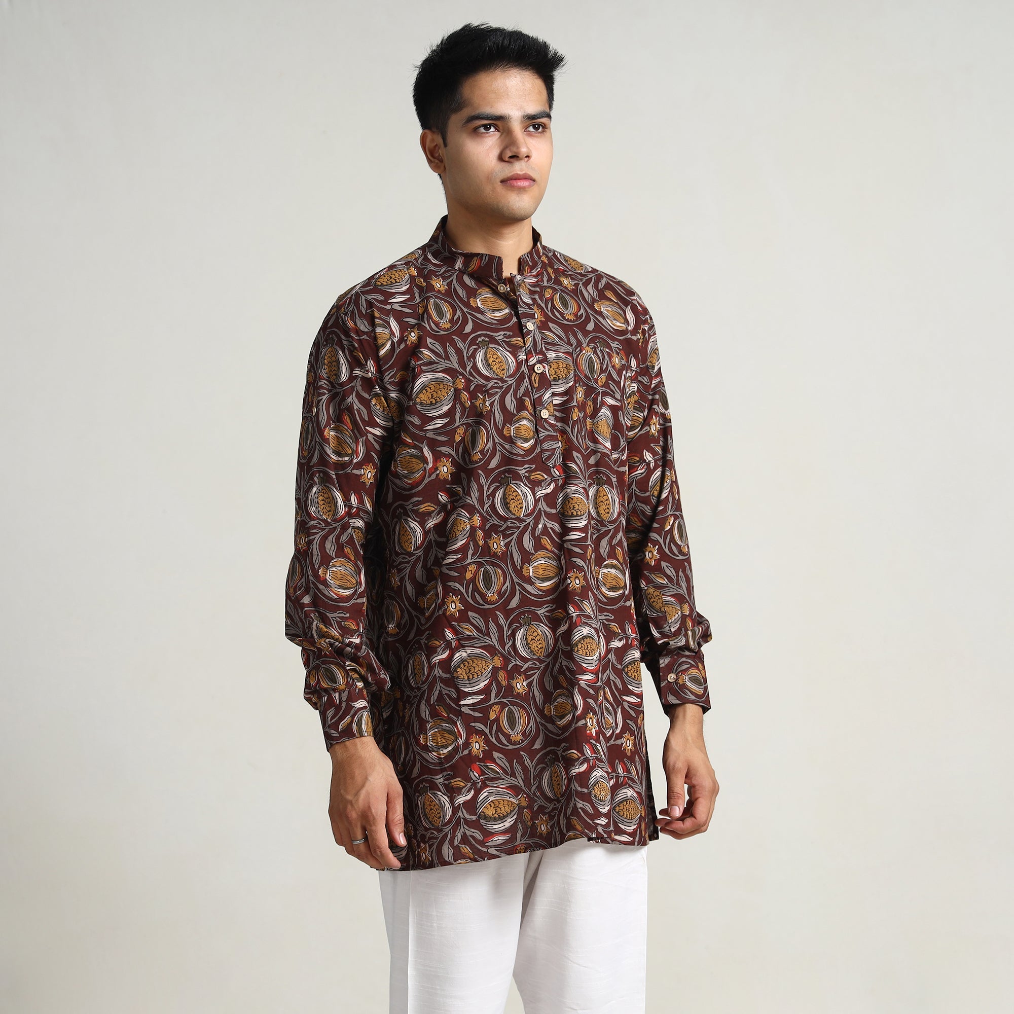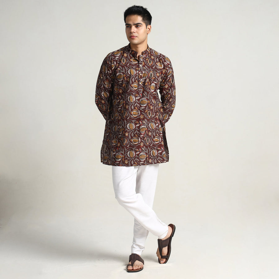 Bagru block printed cotton men's short kurta with one chest pocket, makes you comfortable with ease all day long. It's made from cotton fabric and features full sleeves, a front button placket. This casual kurta is perfect for your daily outing and for a special occasion. Made using natural dyes through traditional mud resist process by using hand carved wooden block practiced in Bagru, Rajasthan.
