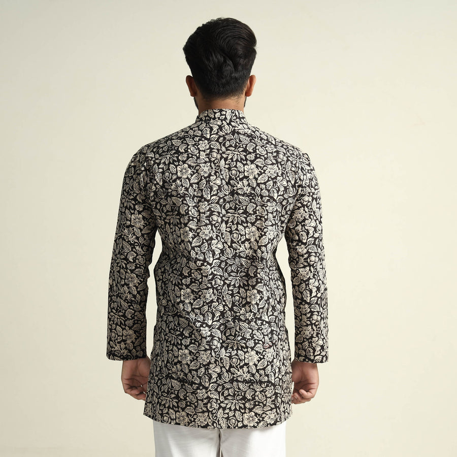 | Material | Bagru block printed cotton men's short kurta with one chest pocket, makes you comfortable with ease all day long. It's made from cotton fabric and features full sleeves, a front button placket. This casual kurta is perfect for your daily outing and for a special occasion. Made using natural dyes through traditional mud resist process by using hand carved wooden block practiced in Bagru, Rajasthan. |