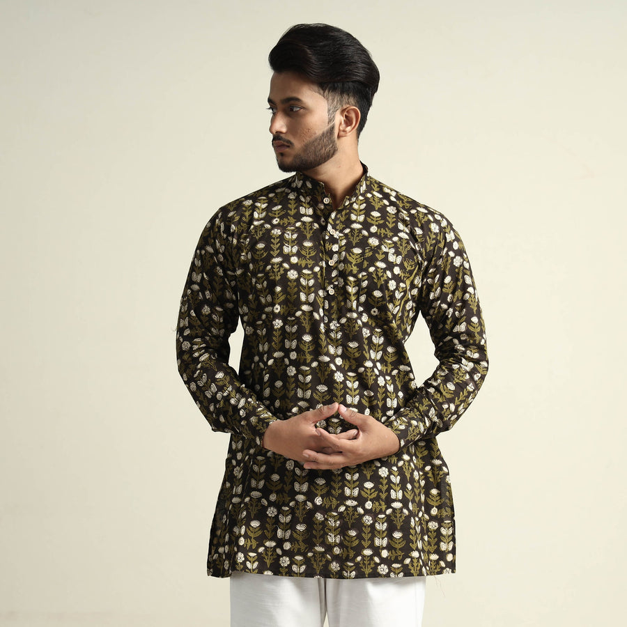 | Material | Bagru block printed cotton men's short kurta with one chest pocket, makes you comfortable with ease all day long. It's made from cotton fabric and features full sleeves, a front button placket. This casual kurta is perfect for your daily outing and for a special occasion. Made using natural dyes through traditional mud resist process by using hand carved wooden block practiced in Bagru, Rajasthan. |