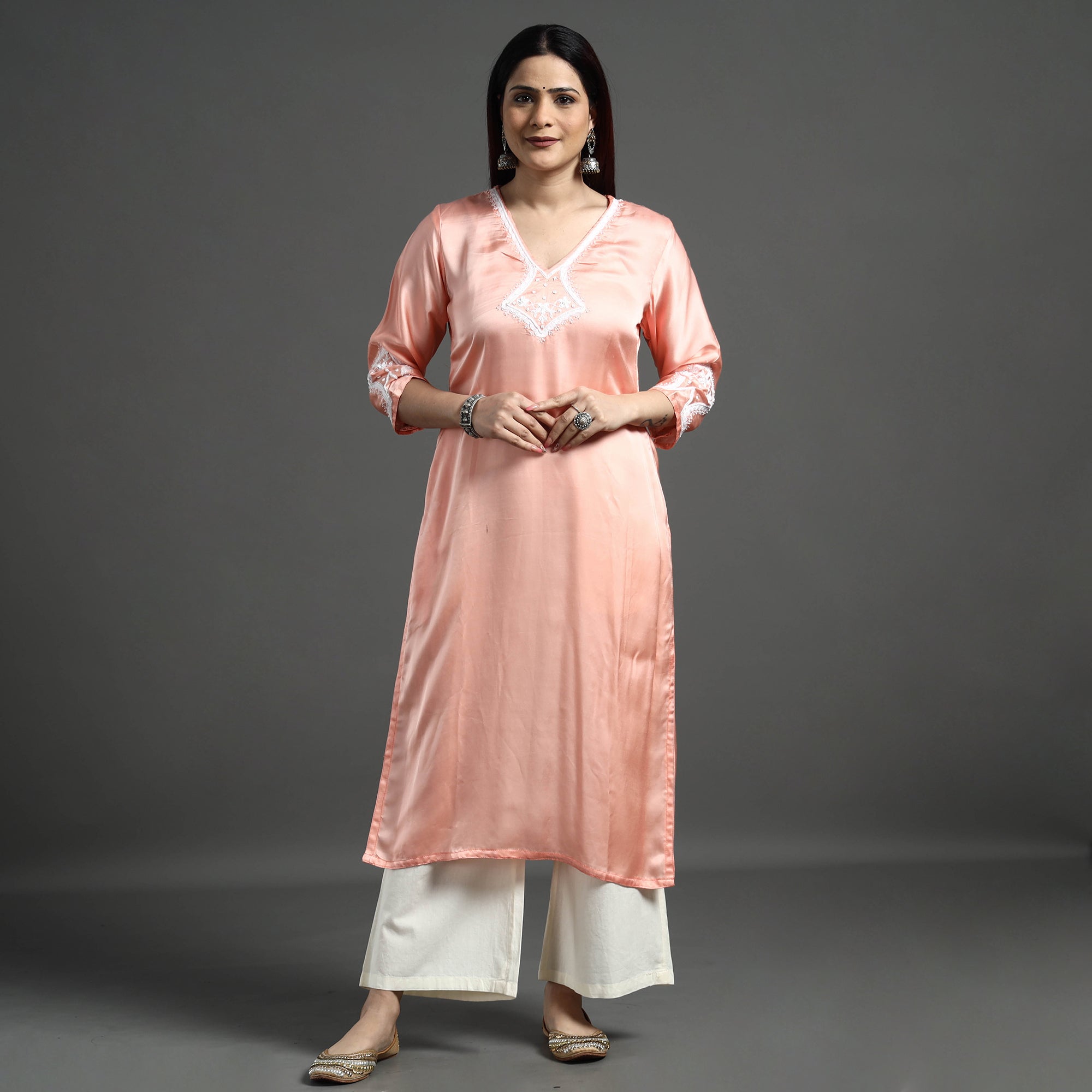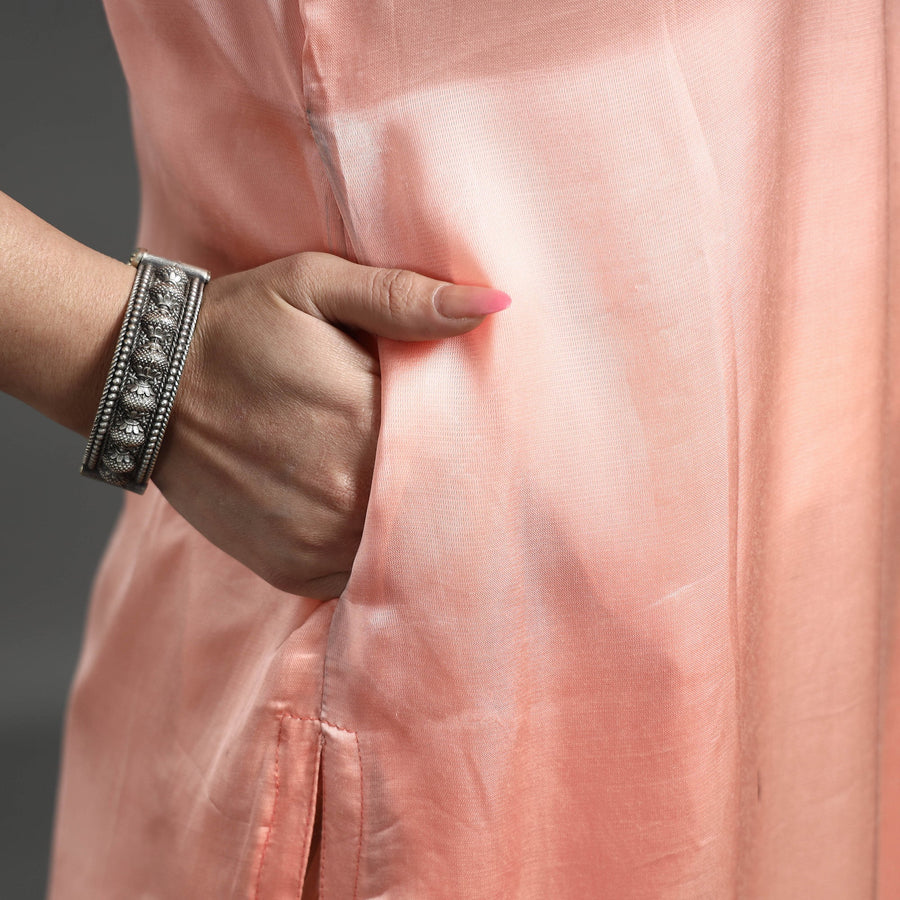 Look and feel beautiful in this uniquely designed palin modal silk hand embroidered long kurta with one side pocket. This modal silk kurta makes you comfortable with ease all day long. This kurta is perfect for your daily outing and for a special occasion. Modal silk is a soft, shiny and highly lustrous fabric, achieved through interlacing modal fibers and silk yarns. it has opulence of silk and the comfort of cotton modal is a fine and soft textured weave.