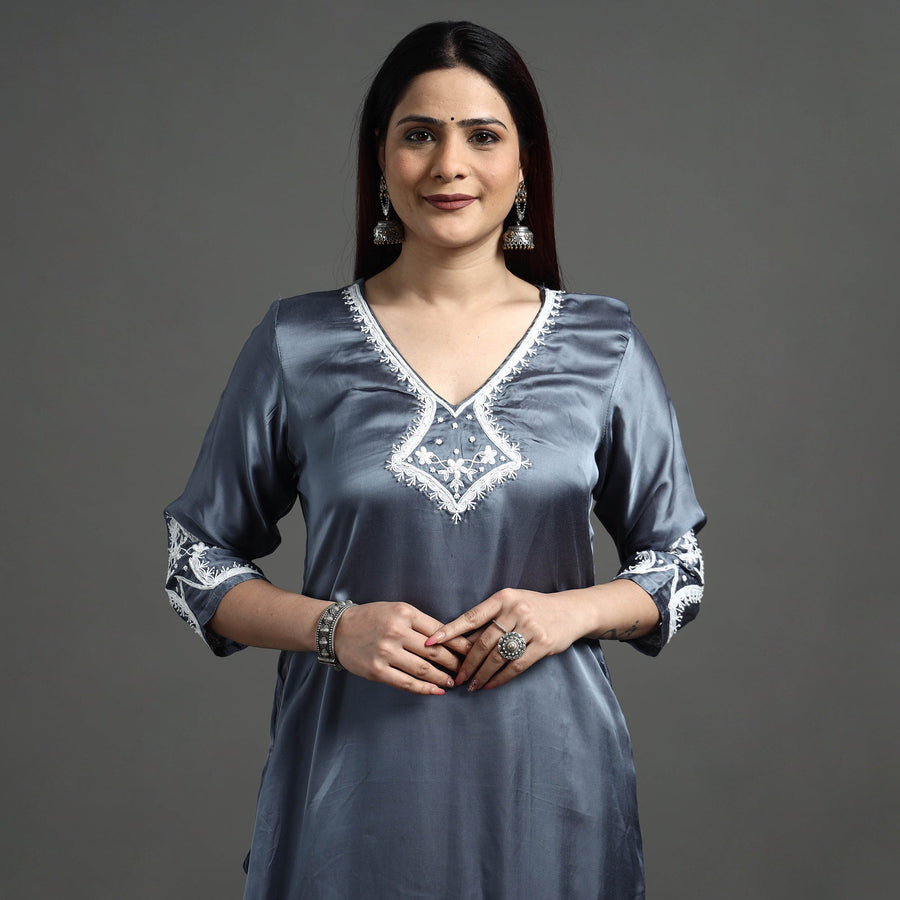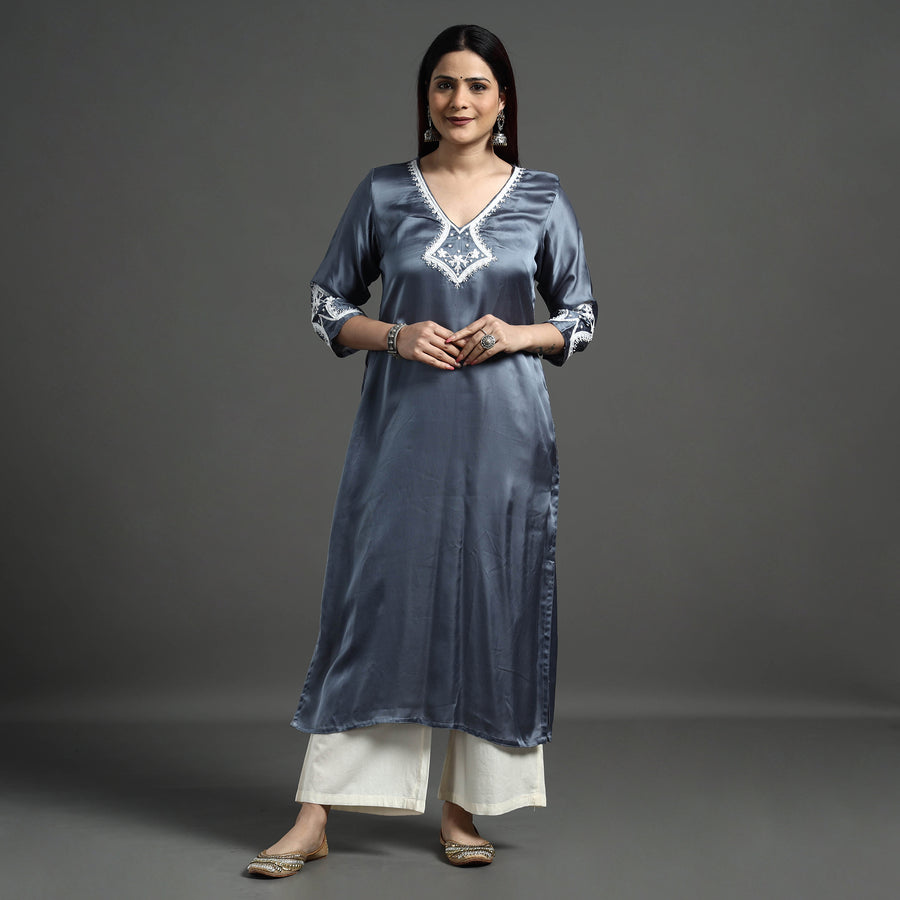 Look and feel beautiful in this uniquely designed palin modal silk hand embroidered long kurta with one side pocket. This modal silk kurta makes you comfortable with ease all day long. This kurta is perfect for your daily outing and for a special occasion. Modal silk is a soft, shiny and highly lustrous fabric, achieved through interlacing modal fibers and silk yarns. it has opulence of silk and the comfort of cotton modal is a fine and soft textured weave.