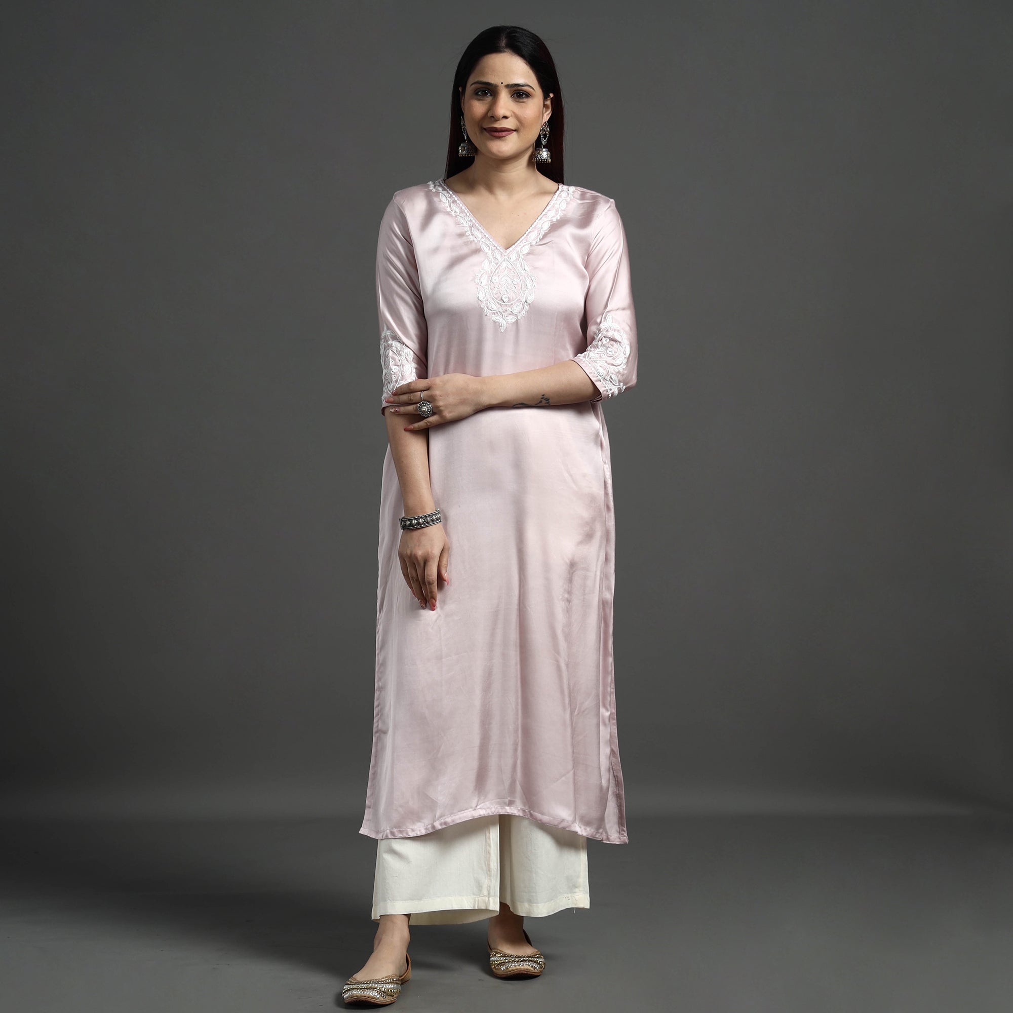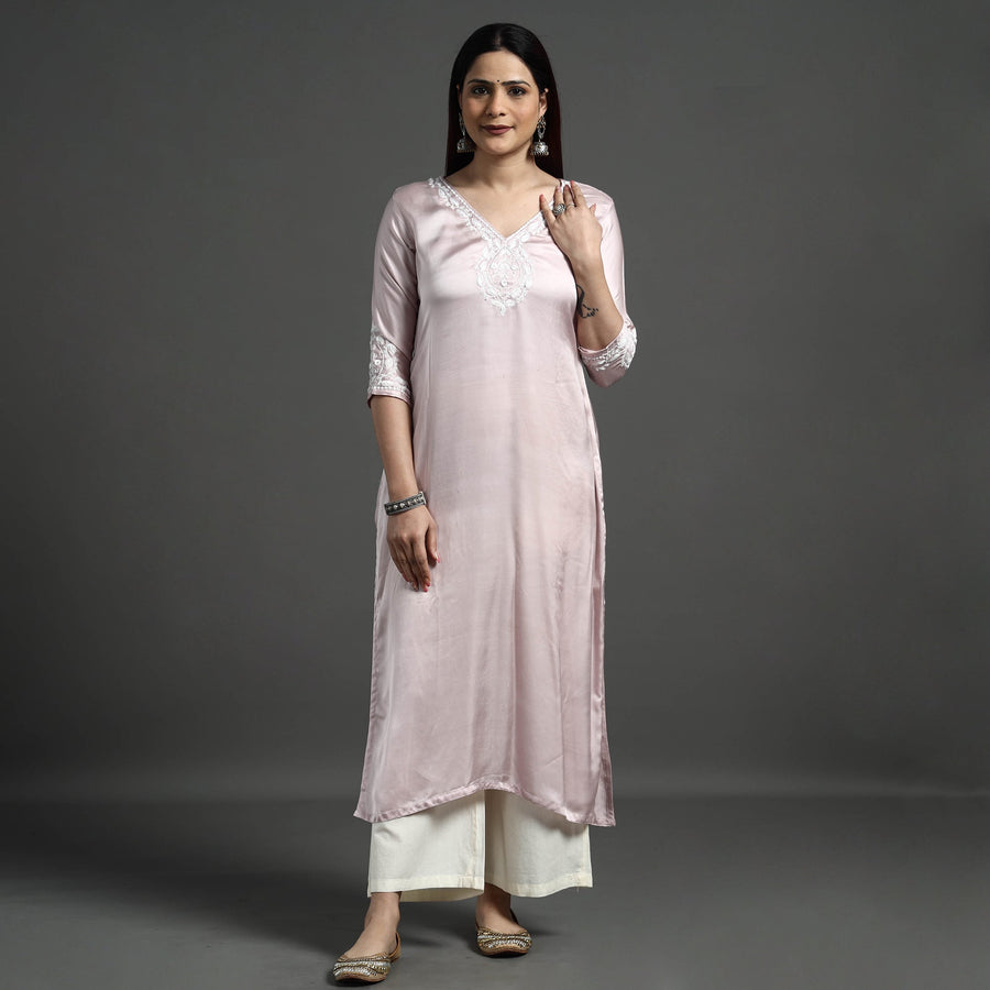 Look and feel beautiful in this uniquely designed palin modal silk hand embroidered long kurta with one side pocket. This modal silk kurta makes you comfortable with ease all day long. This kurta is perfect for your daily outing and for a special occasion. Modal silk is a soft, shiny and highly lustrous fabric, achieved through interlacing modal fibers and silk yarns. it has opulence of silk and the comfort of cotton modal is a fine and soft textured weave.