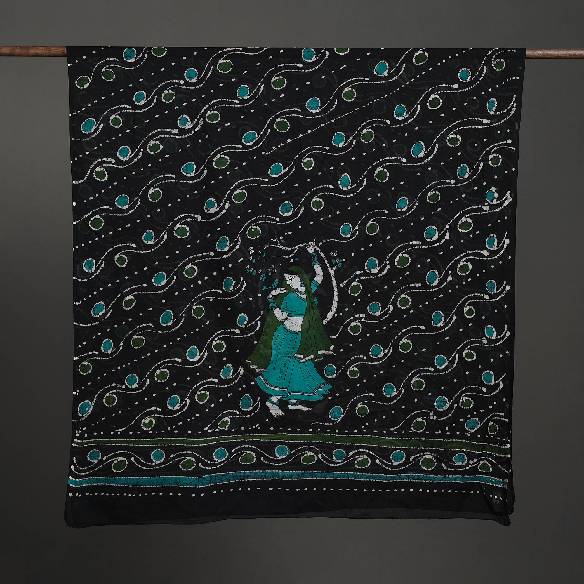 Fine quality hand batik printed cotton black dupatta from Ujjain, Madhya Pradesh.Batik is a technique of wax-resist dyeing applied to whole cloth, or cloth made using this technique. The traditional designs and motifs in Indian batik are often passed down from one generation to another.