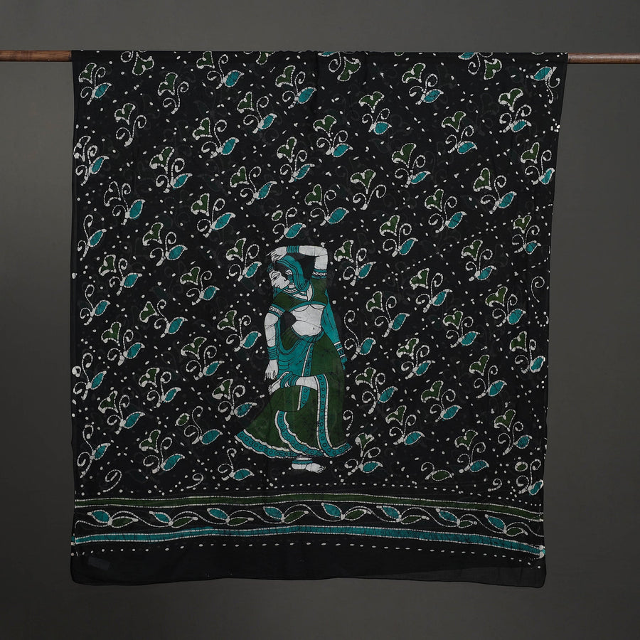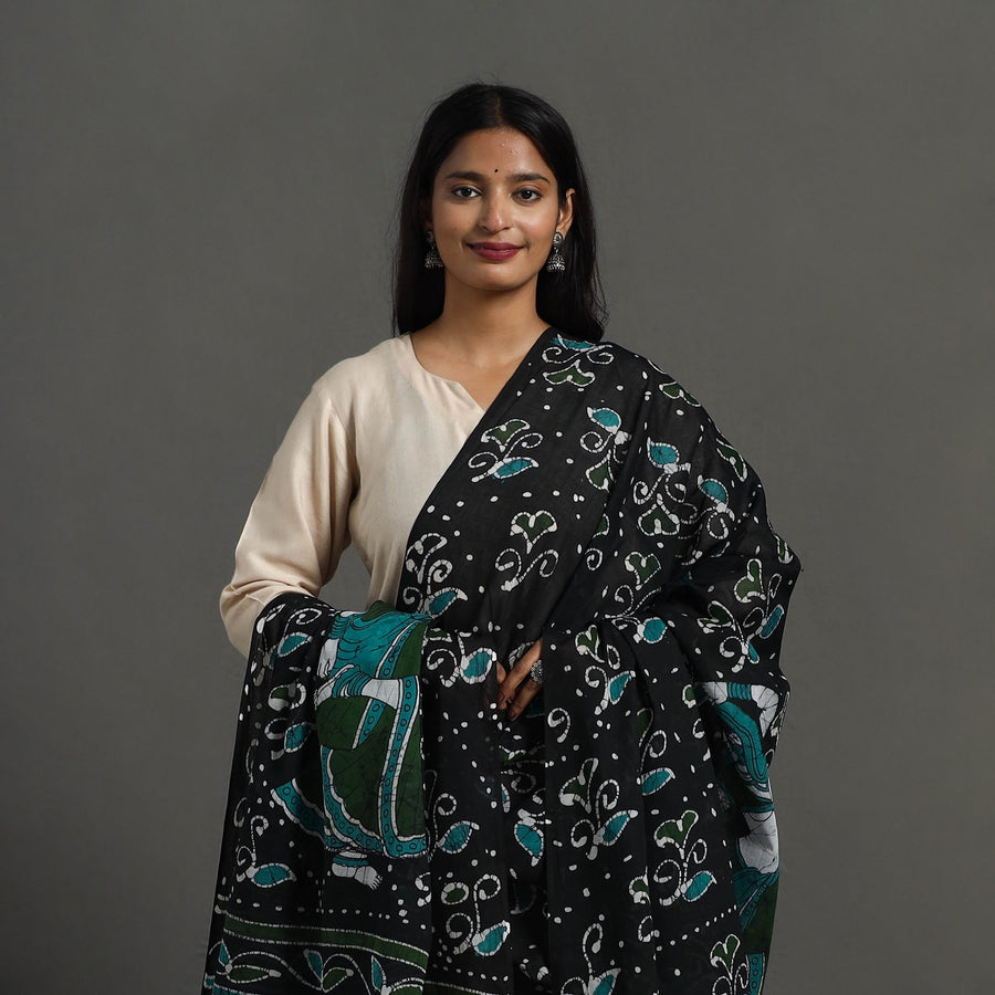 Fine quality black hand batik printed cottondupatta from Ujjain, Madhya Pradesh.Batik is a technique of wax-resist dyeing applied to whole cloth, or cloth made using this technique. The traditional designs and motifs in Indian batik are often passed down from one generation to another.
