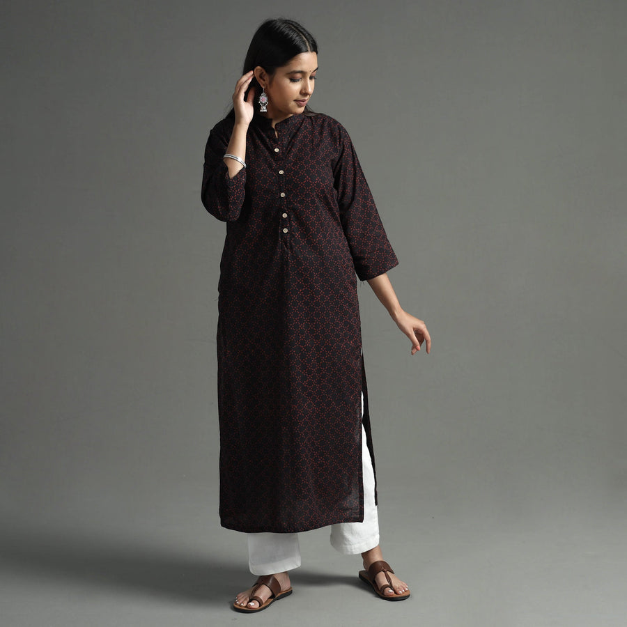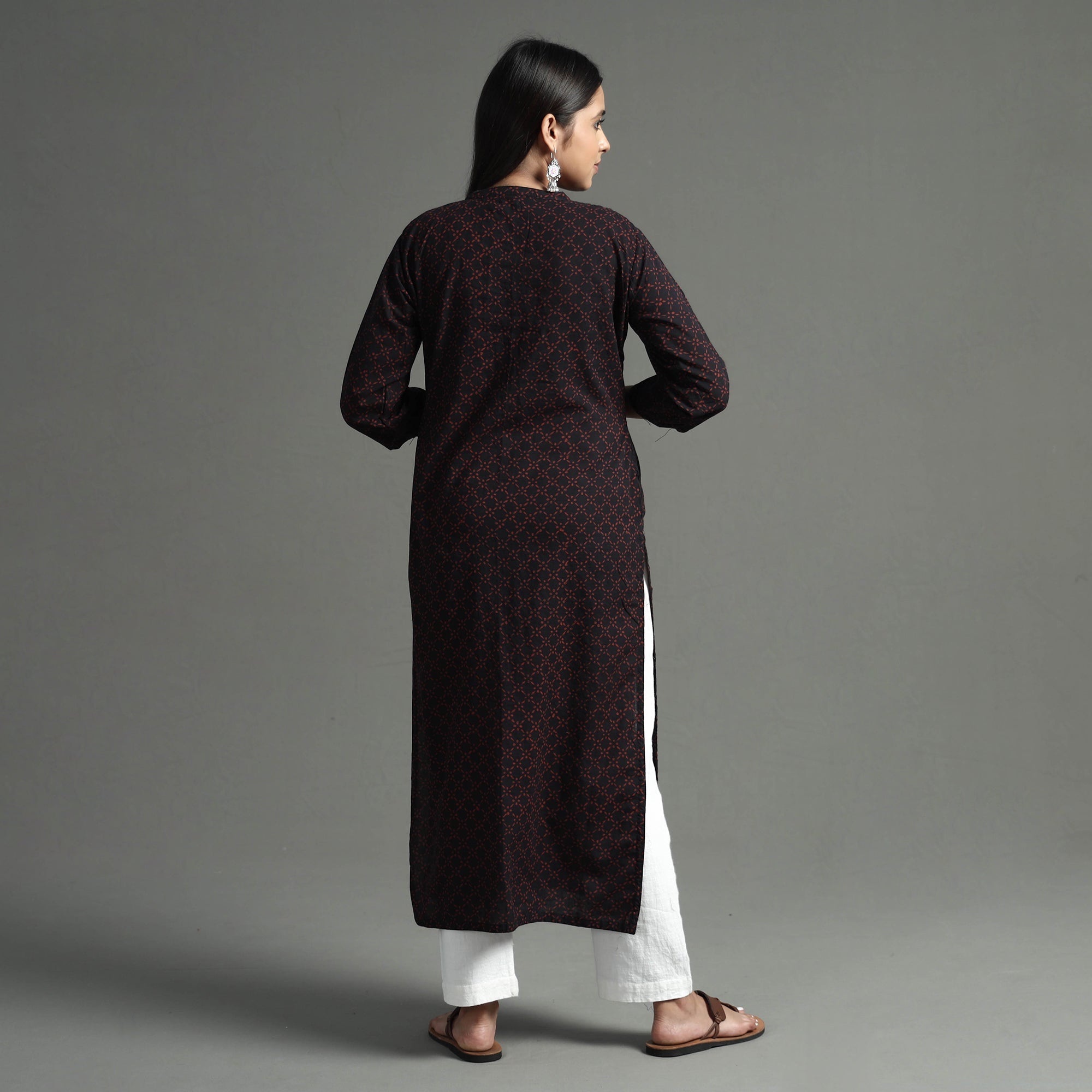 This uniquely designed akola hand block printed cotton long kurta is made using naturally dyed cotton fabric through the traditional mud resist process of hand block printing practised by the master artisans in Akola village of Rajasthan. The kurta also features a convenient one-side pocket, perfect for carrying small essentials. This cotton kurta makes you comfortable all day long. This kurta is perfect for your daily outing and for a special occasion.