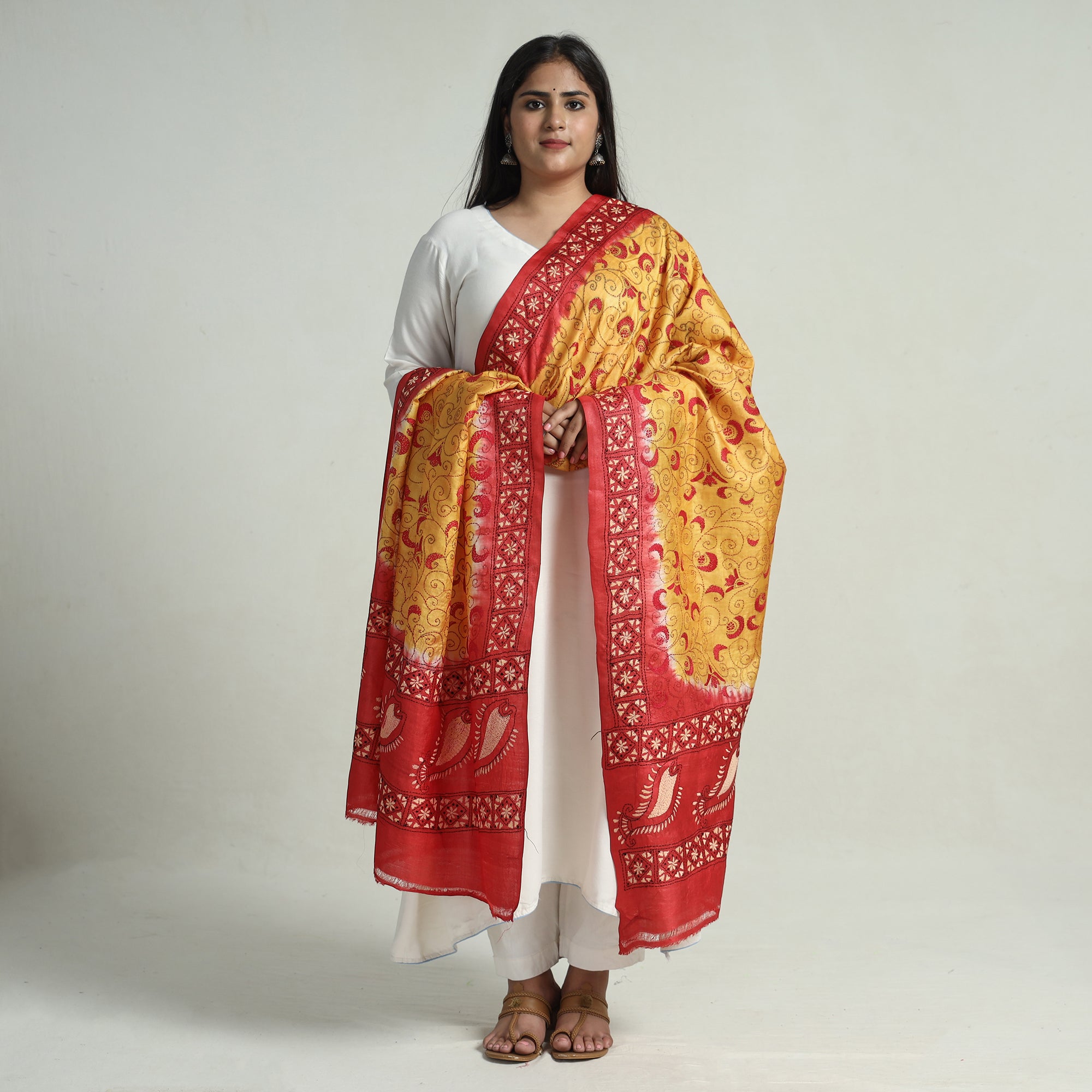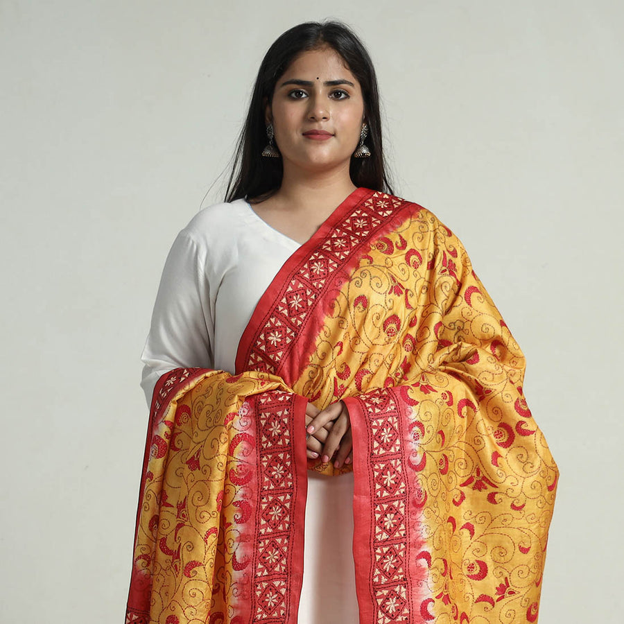 Elevate your style with our exquisite bengal kantha hand embroidery tussar silk handloom dupatta, designed with contemporary patterns & has been hand embroidered using West Bengal's traditional craft technique of Kantha. Tussar silk is known for its unique texture, sheen of silk, and feel of cotton. A perfect blend of both worlds, completely suitable for all weathers.