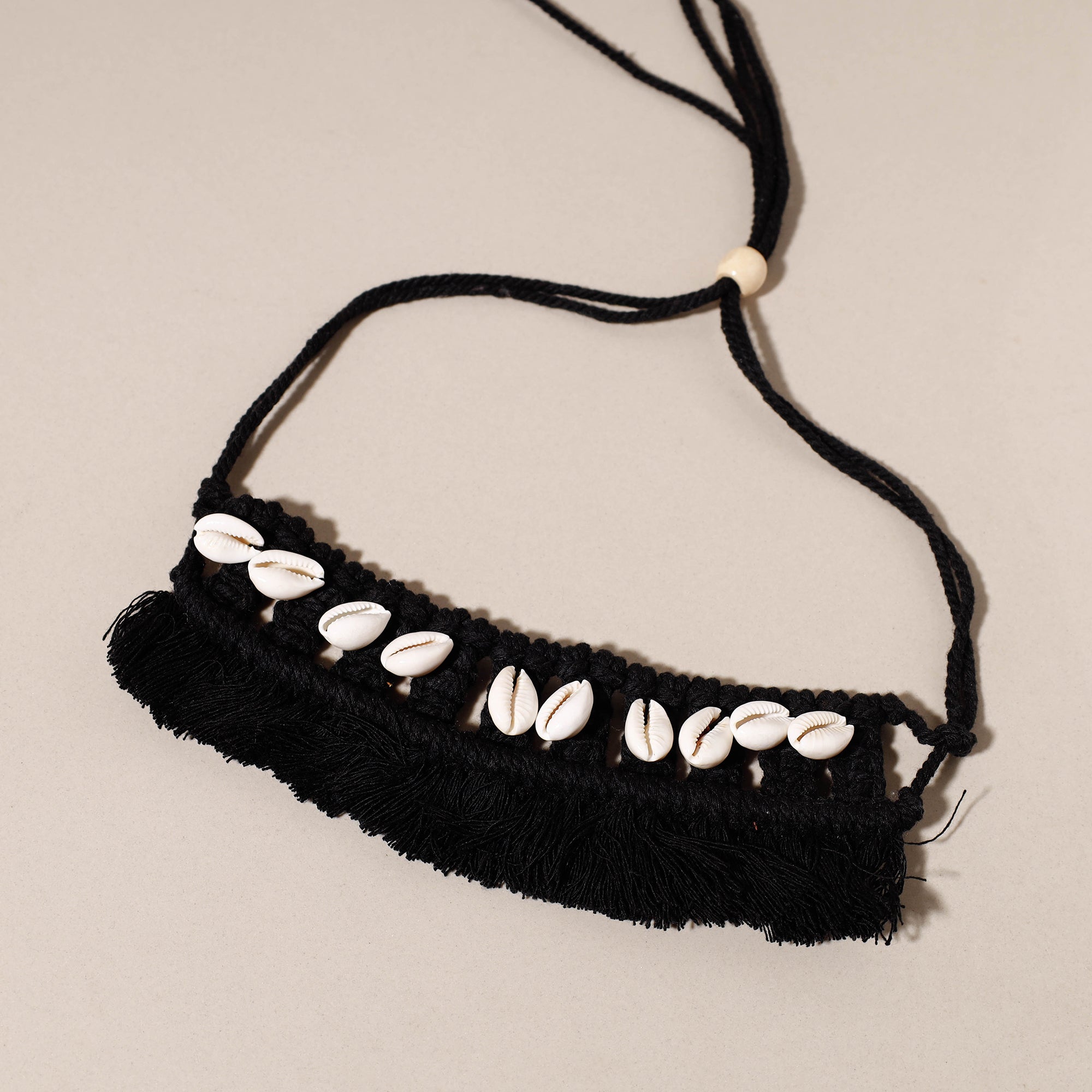 This black handcrafted thread and shell macramé choker necklace is a blend of intricate craftsmanship and natural elegance. This necklace, handcrafted from cotton threads with macramé knots, reflects the skill and passion of our artisans.