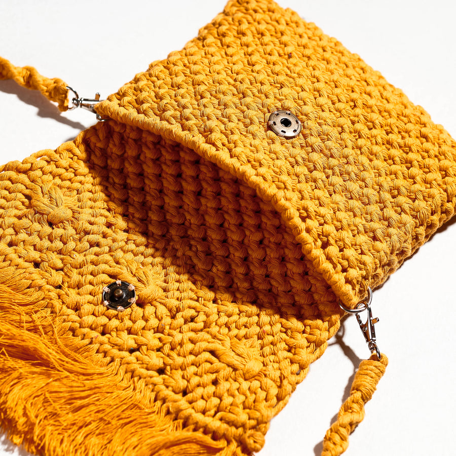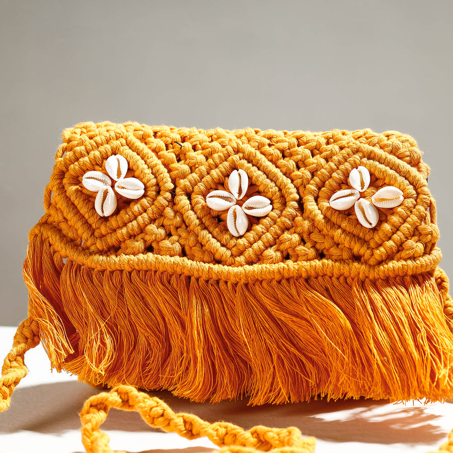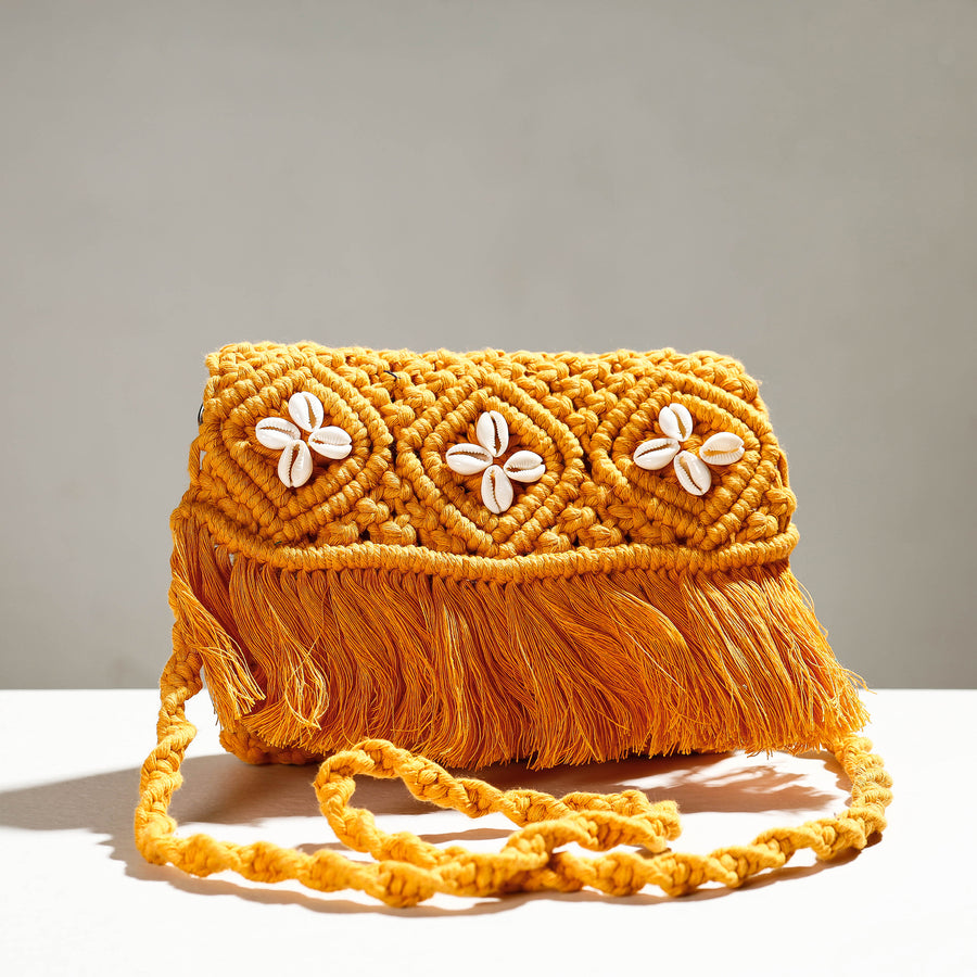 This exquisite yellow handcrafted macramé sling bag is a blend of intricate craftsmanship and natural elegance. This bag comes with a detachable sling. Meticulously handcrafted using cotton threads and shells, this macramé sling bag showcases an artful blend of intricate knotting techniques. Each knot reflects the dedication and skill of our artisans, resulting in a masterpiece of craftsmanship.