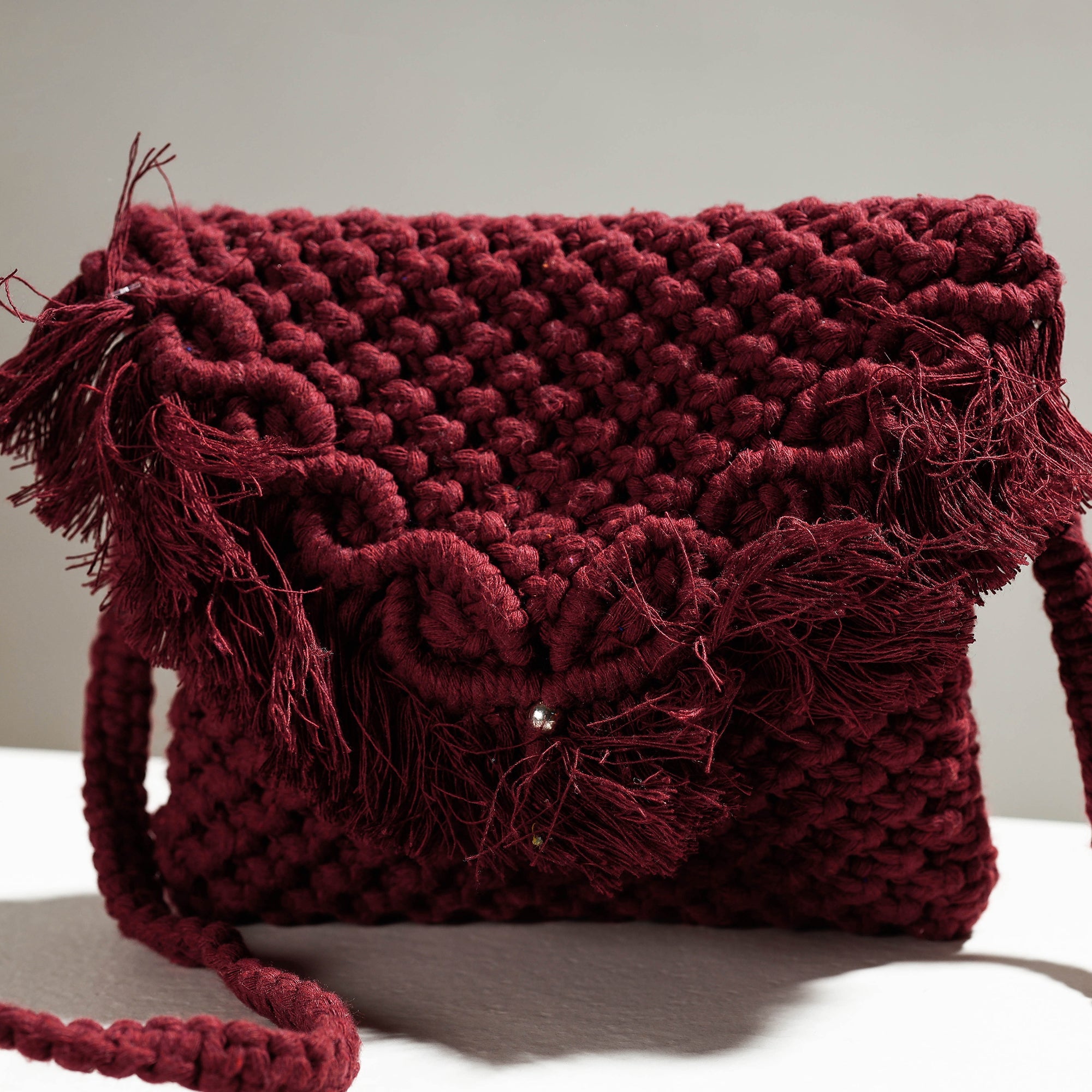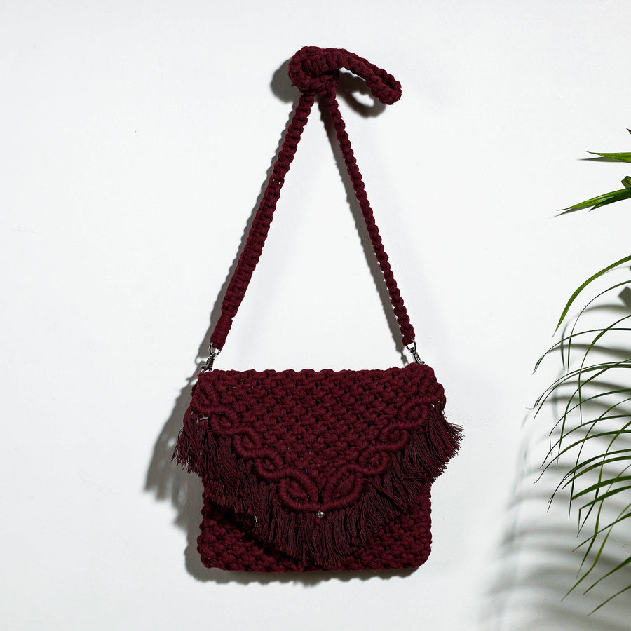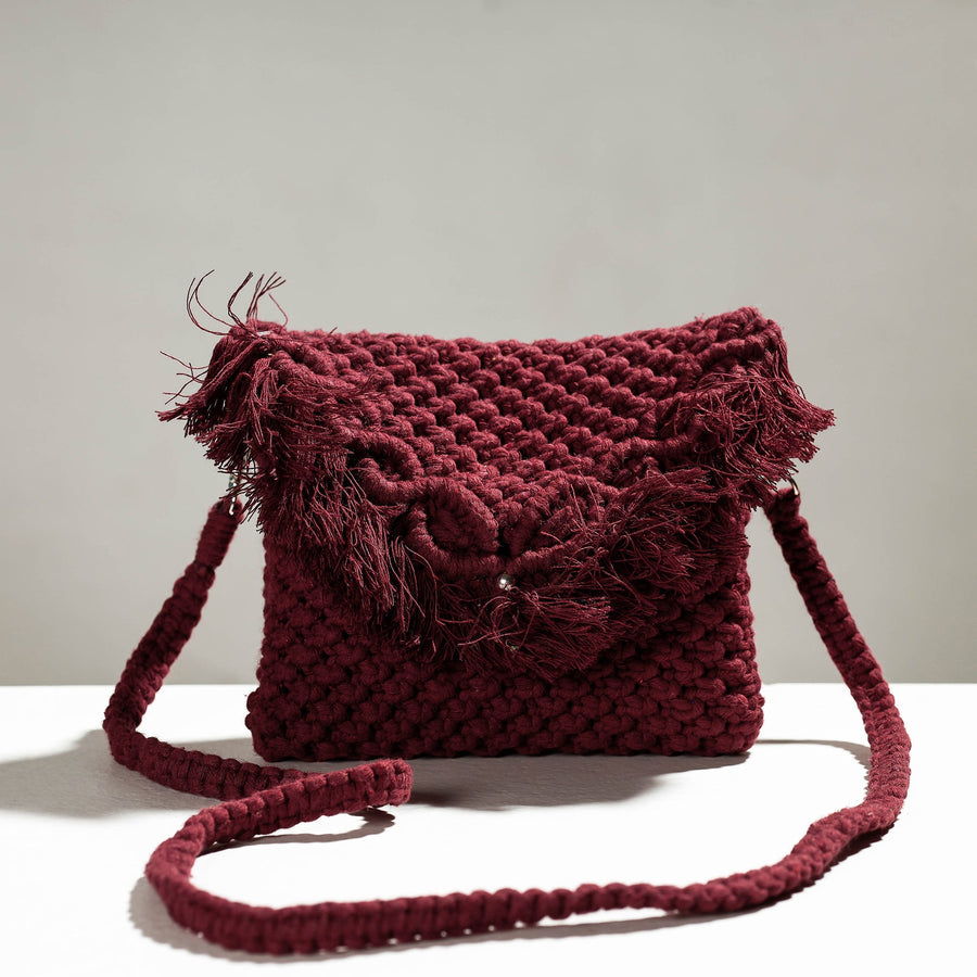 This exquisite brown handcrafted macramé sling bag is a blend of intricate craftsmanship and natural elegance. This bag comes with a detachable sling. Meticulously handcrafted using cotton threads, this macramé sling bag showcases an artful blend of intricate knotting techniques. Each knot reflects the dedication and skill of our artisans, resulting in a masterpiece of craftsmanship.
