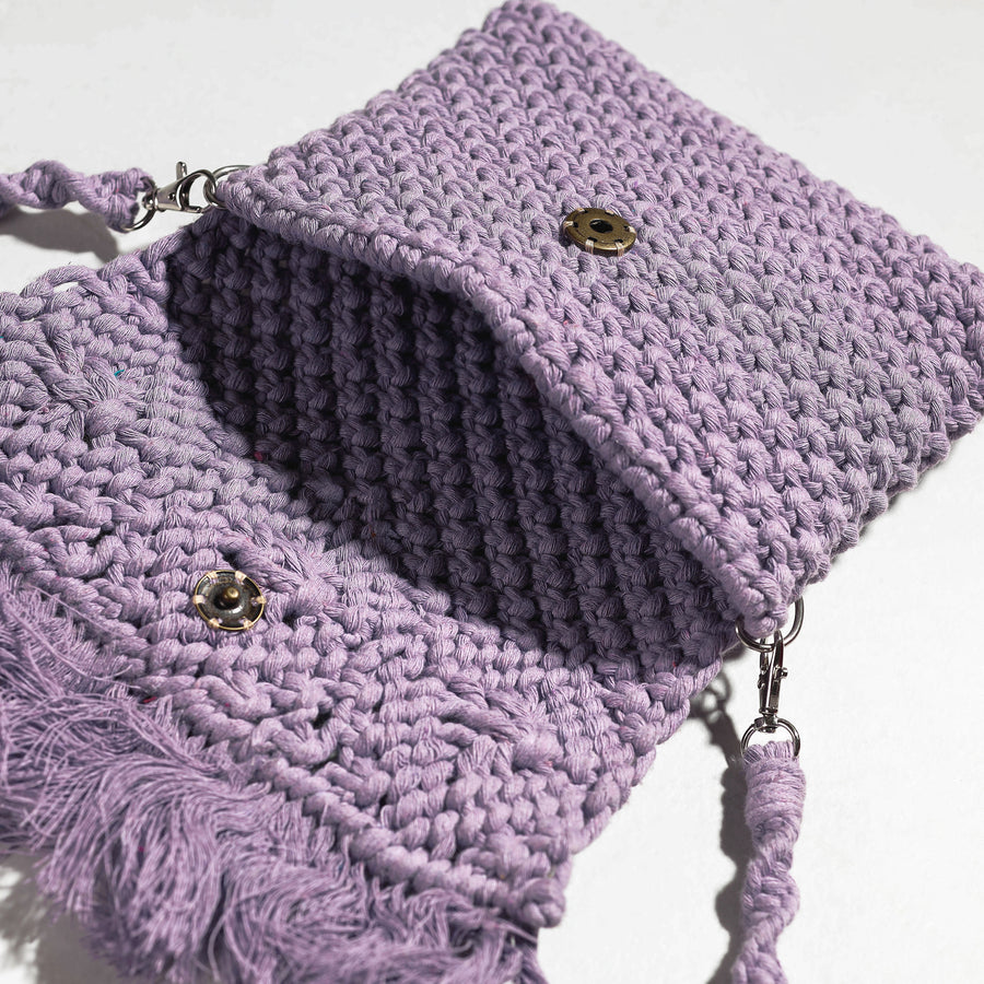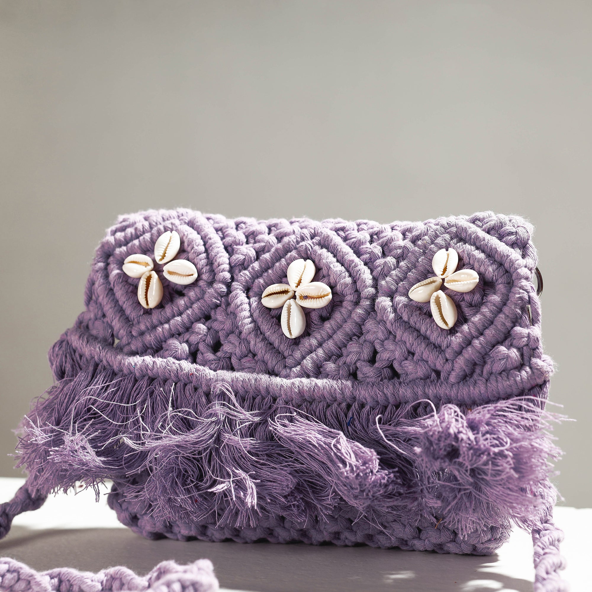 This exquisite purple handcrafted macramé sling bag is a blend of intricate craftsmanship and natural elegance. This bag comes with a detachable sling. Meticulously handcrafted using cotton threads and shells, this macramé sling bag showcases an artful blend of intricate knotting techniques. Each knot reflects the dedication and skill of our artisans, resulting in a masterpiece of craftsmanship.