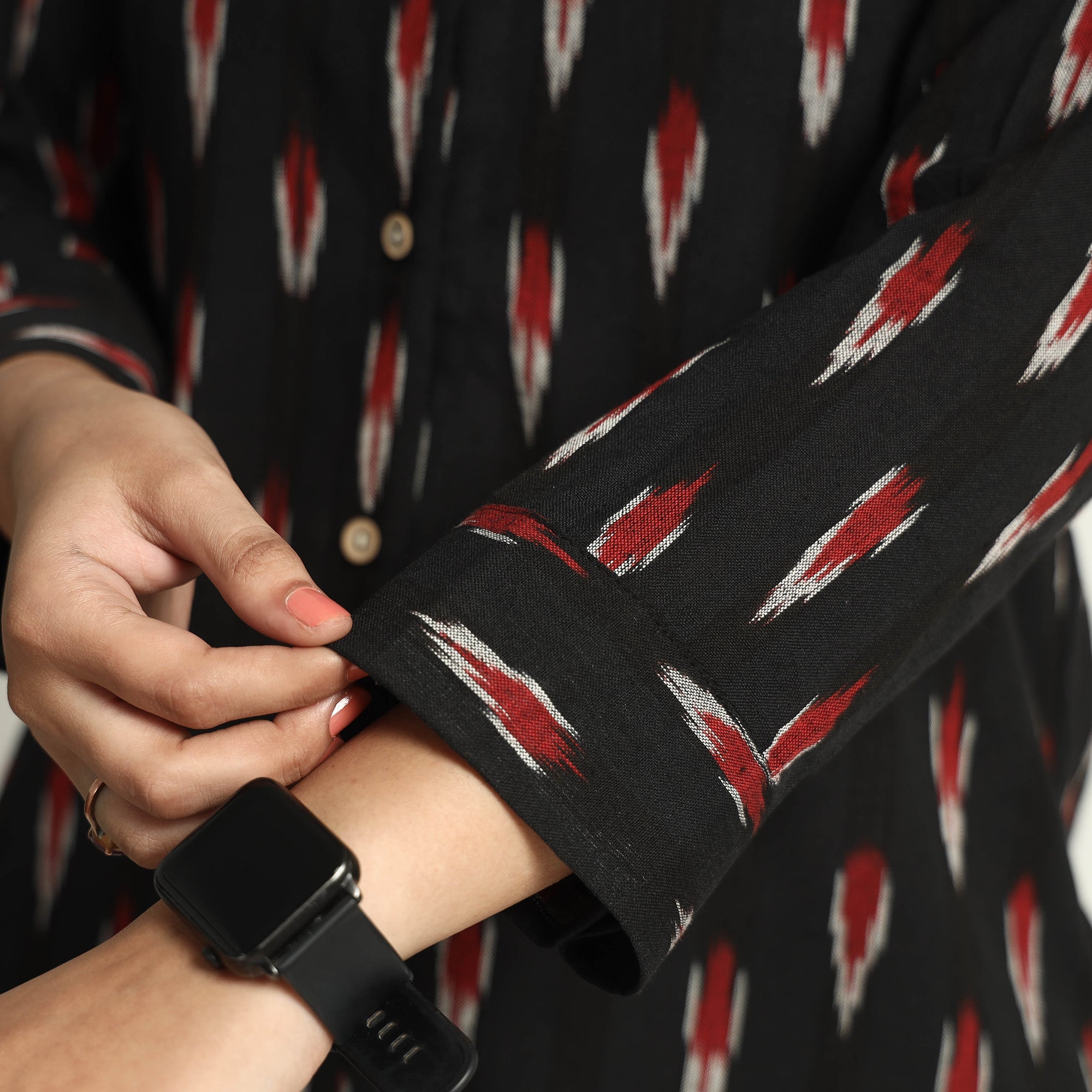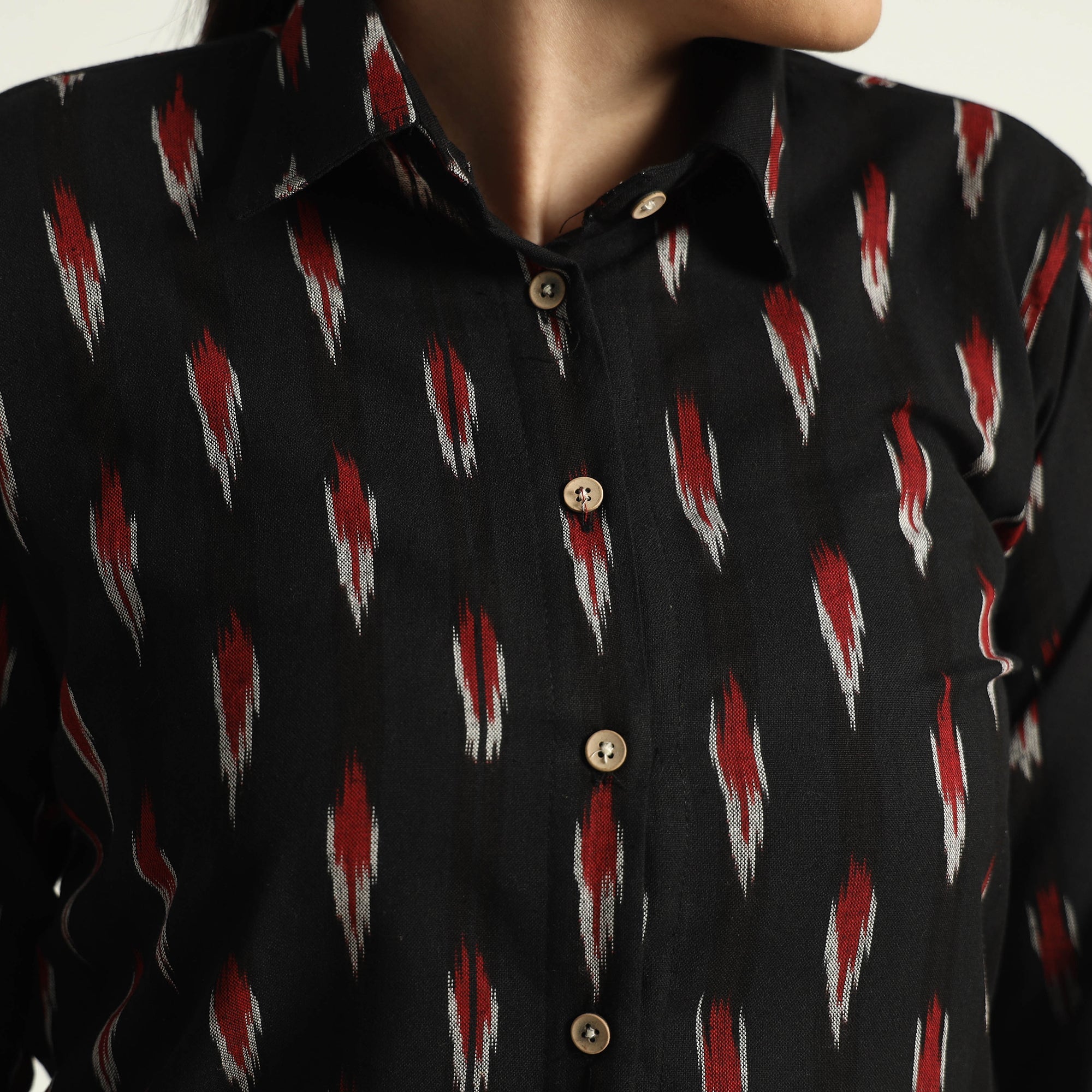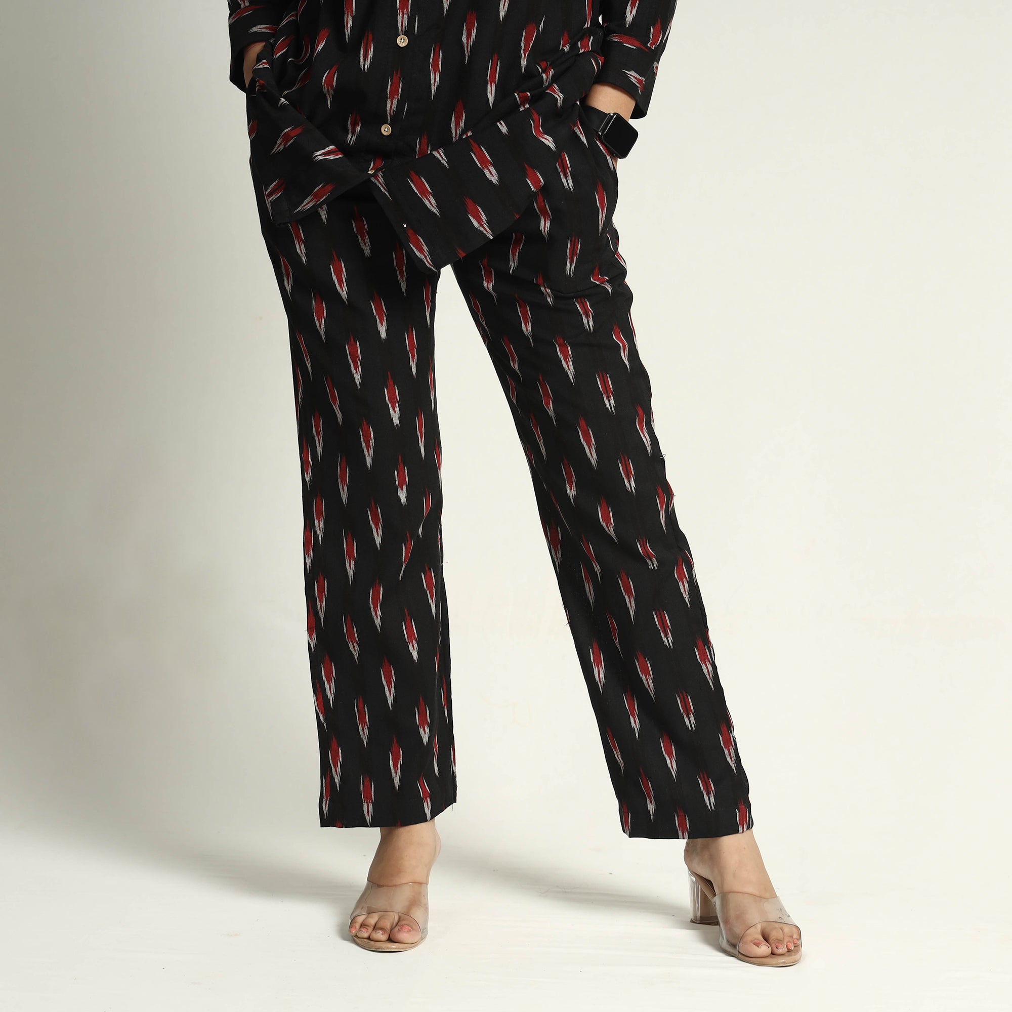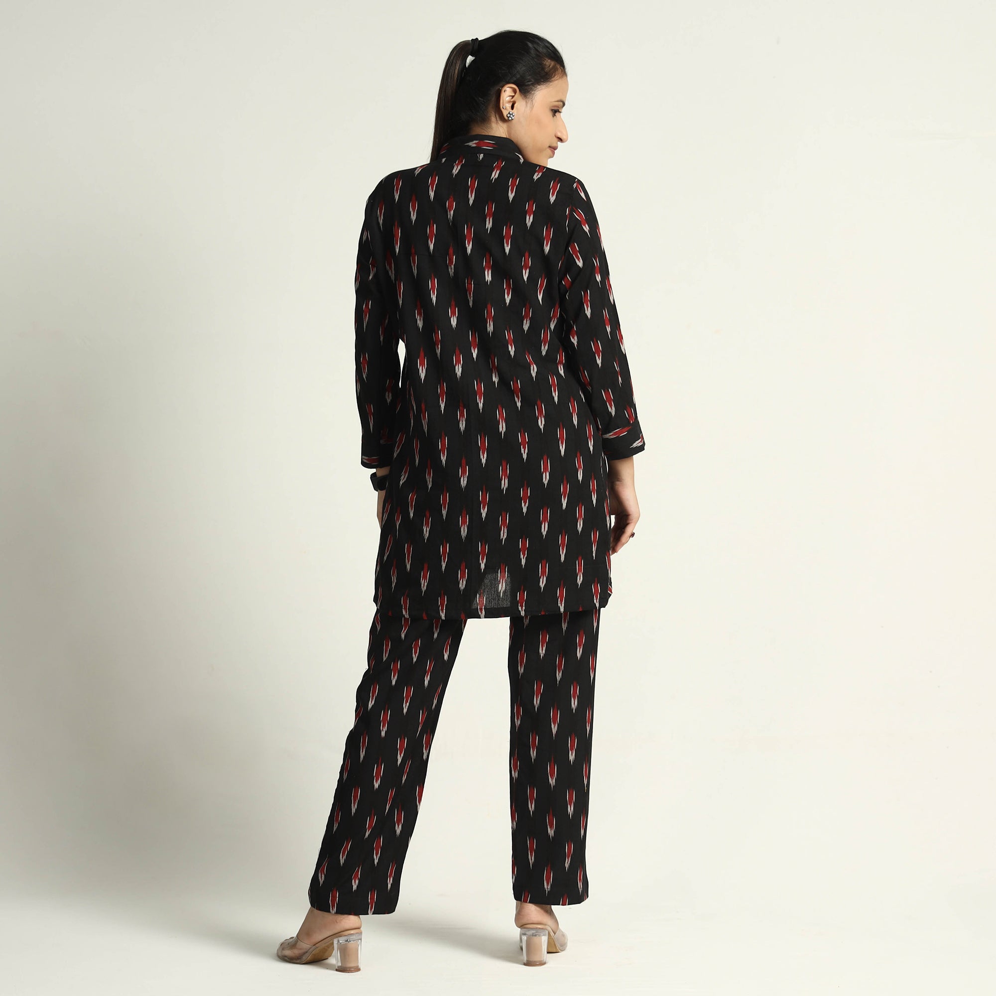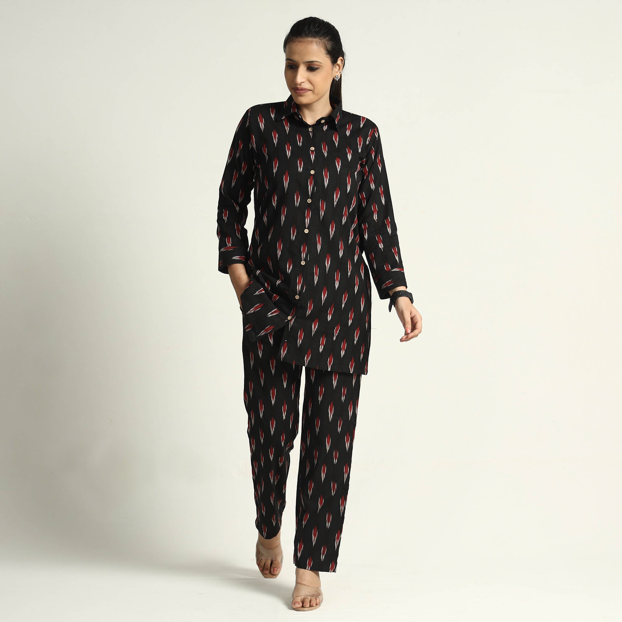 Stay comfortable and stylish in this cotton two-piece Co-ord set. The set features an elasticated pant and a regular collared shirt with a wooden button placket. Crafted from pochampally ikat-weave cotton fabric, this two-piece Co-ord set offers comfort and breathability. The soft elasticized waist pant ensures a great fit, while the two side pockets add functionality. The unique design ensures a beautiful and comfortable fit. Stay relaxed and chic all day long in this stunning co-ord set that is perfect for any occasion.