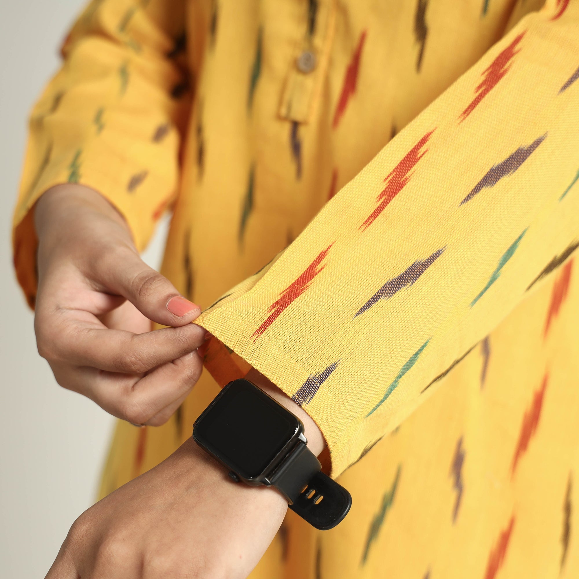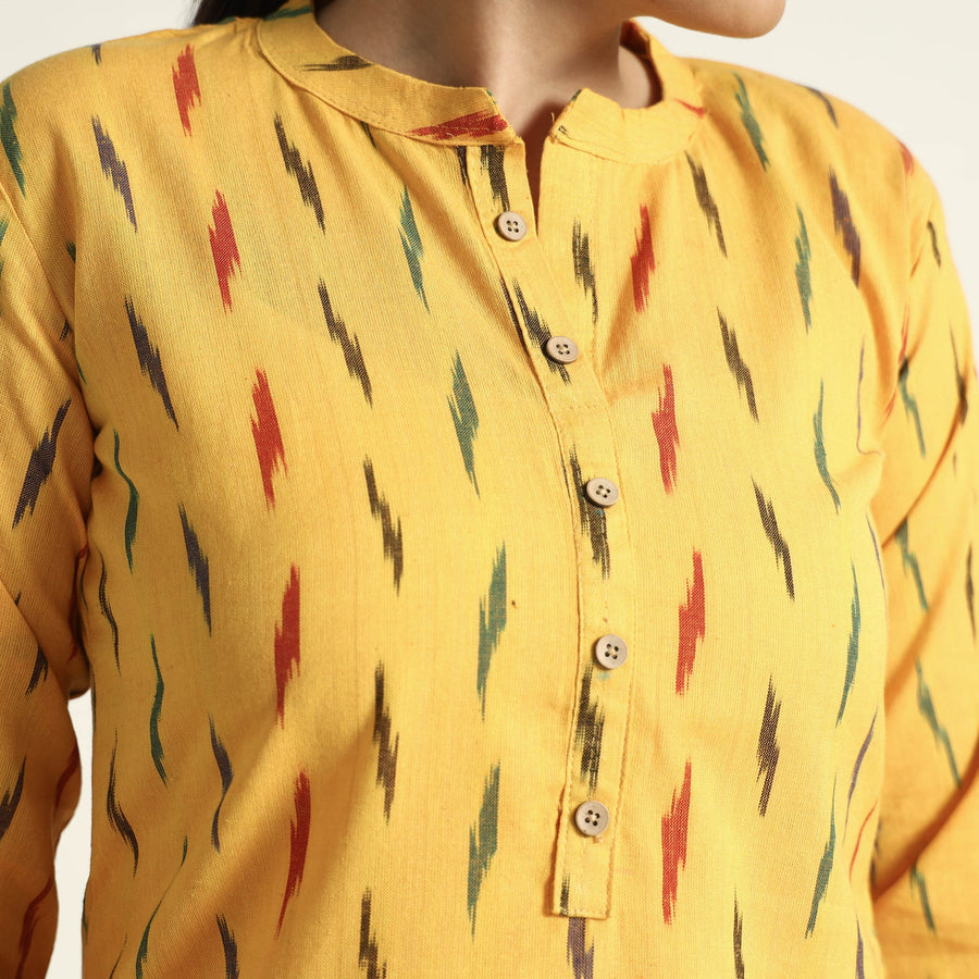 Stay comfortable and stylish in this cotton two-piece Co-ord set. The set features an elasticated pant and a chinese collared short kurti with a wooden button placket. Crafted from pochampally ikat-weave cotton fabric, this two-piece Co-ord set offers comfort and breathability. The soft elasticized waist pant ensures a great fit, while the two side pockets add functionality. The unique design ensures a beautiful and comfortable fit. Stay relaxed and chic all day long in this stunning co-ord set that is perfect for any occasion.