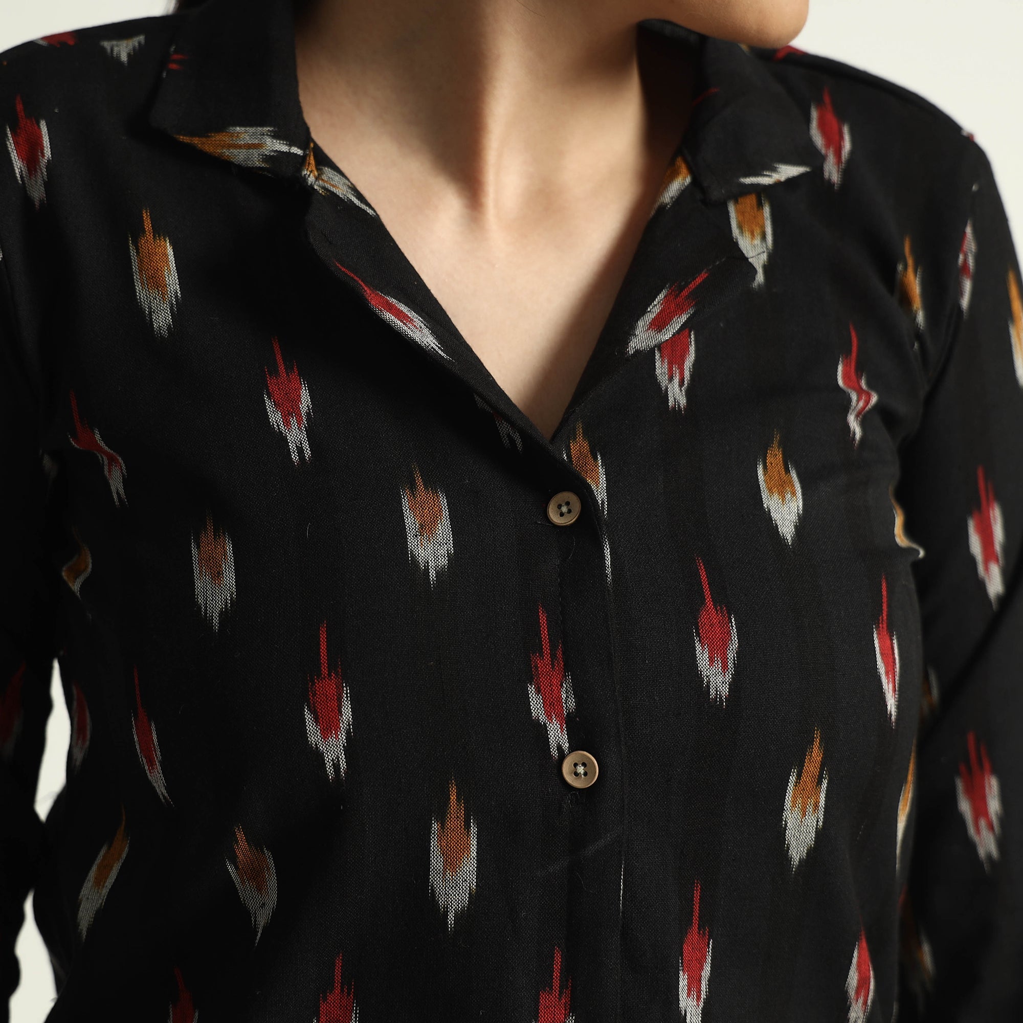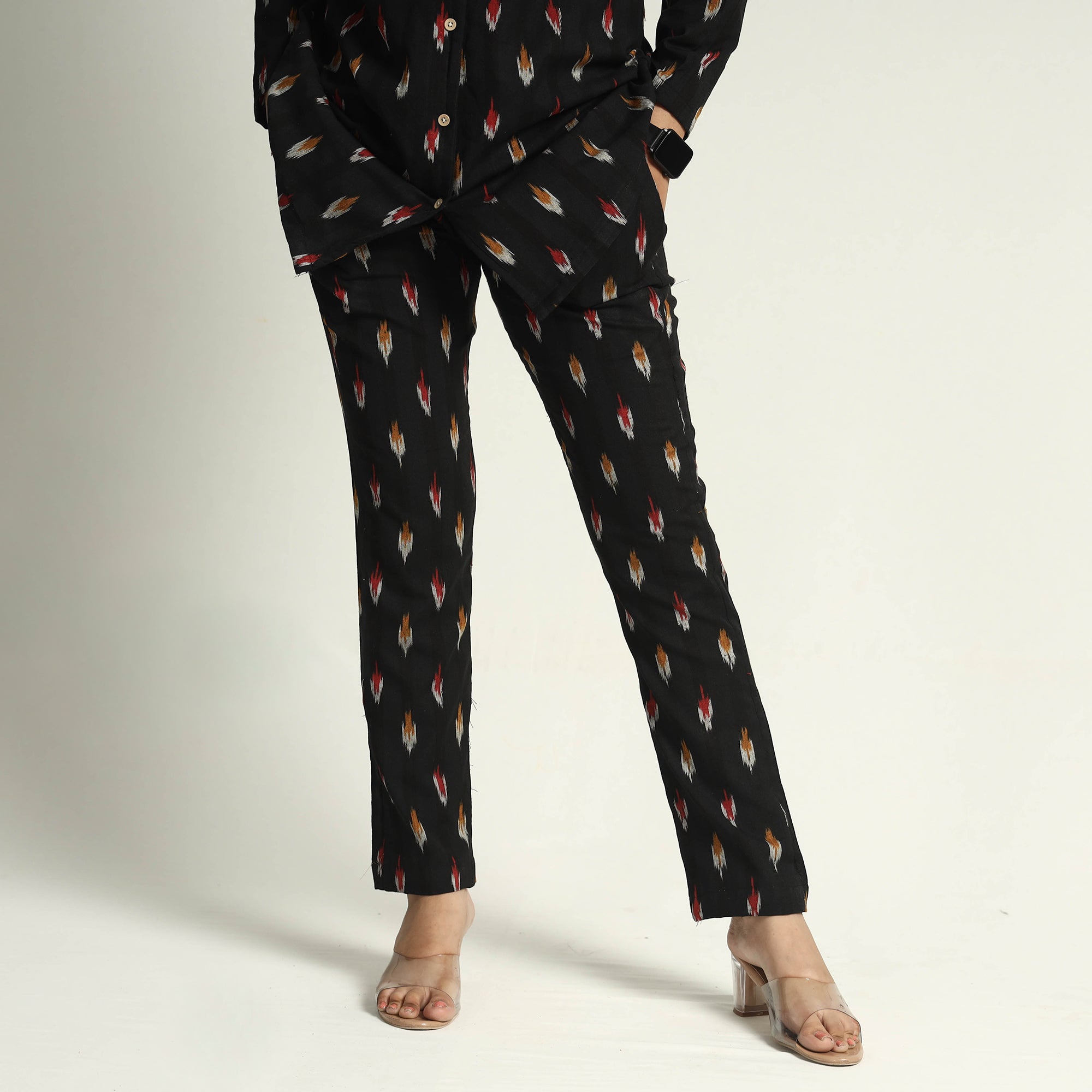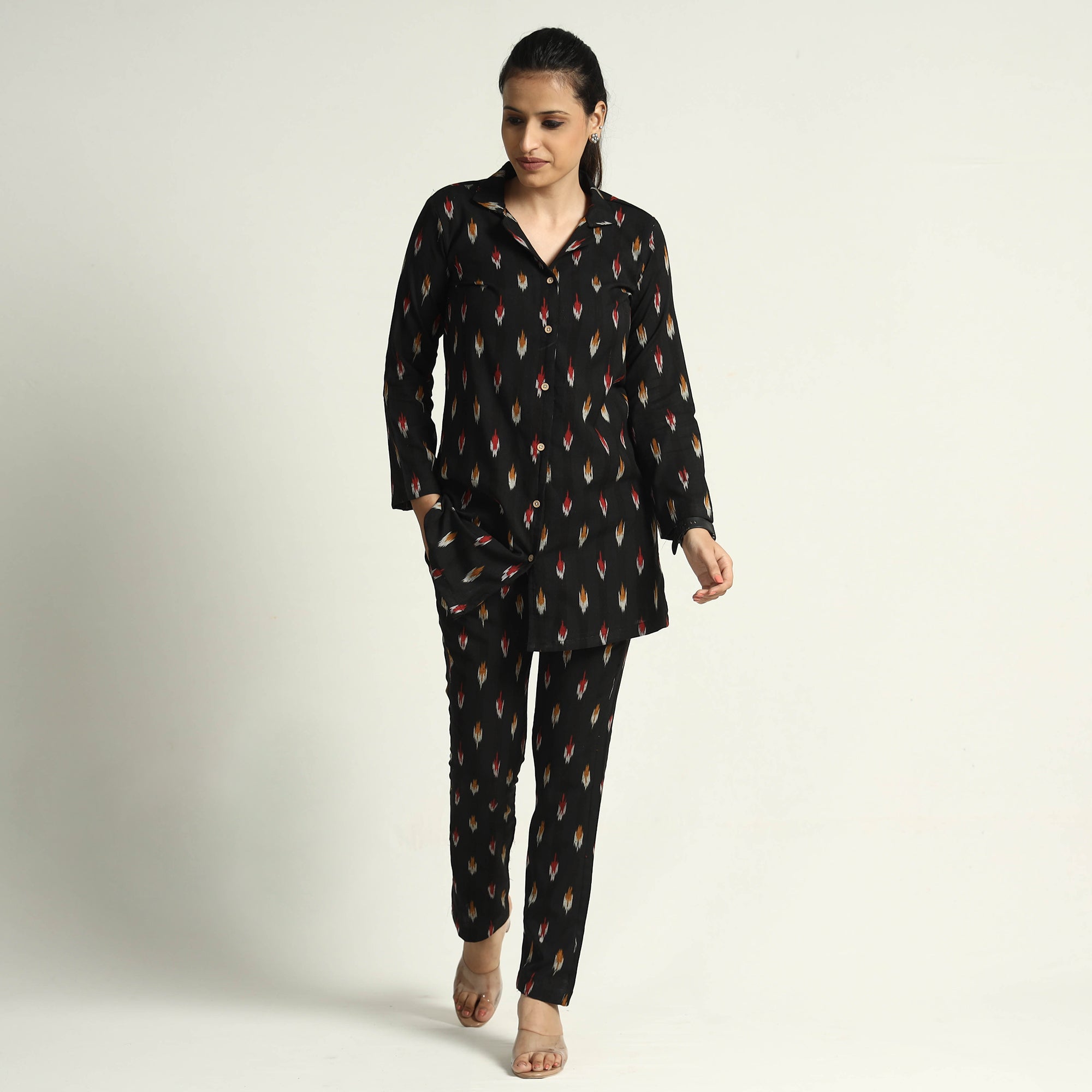 Stay comfortable and stylish in this cotton two-piece Co-ord set. The set features an elasticated pant and a regular collared short kurti with a wooden button placket. Crafted from pochampally ikat-weave cotton fabric, this two-piece Co-ord set offers comfort and breathability. The soft elasticized waist pant ensures a great fit, while the two side pockets add functionality. The unique design ensures a beautiful and comfortable fit. Stay relaxed and chic all day long in this stunning co-ord set that is perfect for any occasion.
