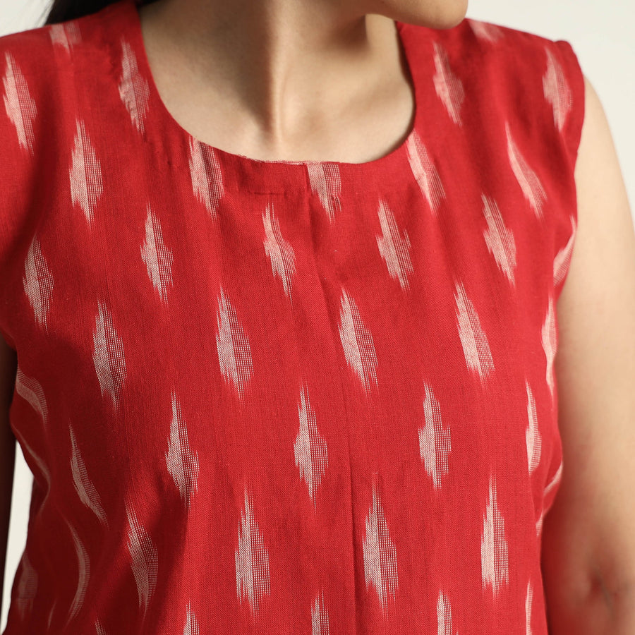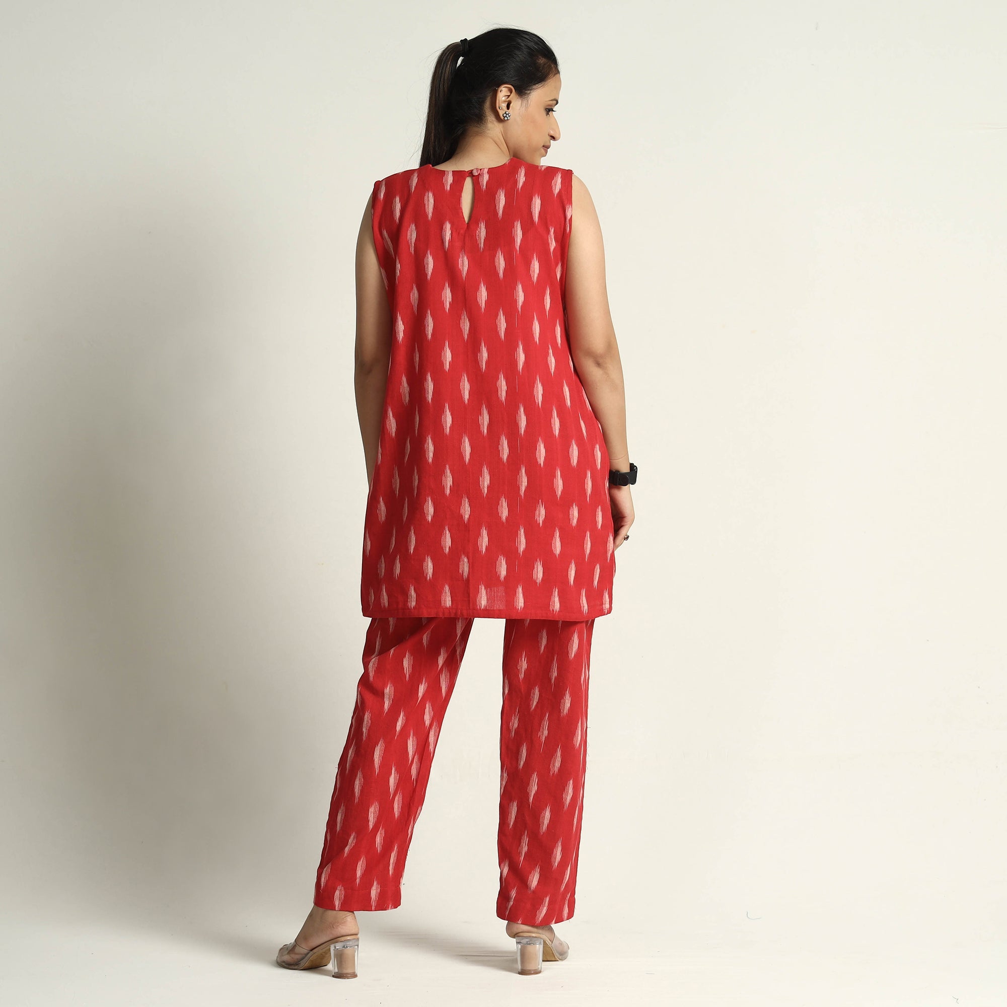 Stay comfortable and stylish in this cotton two-piece Co-ord set. The set features an elasticated pant and a sleeveless short kurti. Crafted from pochampally ikat-weave cotton fabric, this two-piece Co-ord set offers comfort and breathability. The soft elasticized waist pant ensures a great fit, while the two side pockets add functionality. The unique design ensures a beautiful and comfortable fit. Stay relaxed and chic all day long in this stunning co-ord set that is perfect for any occasion.