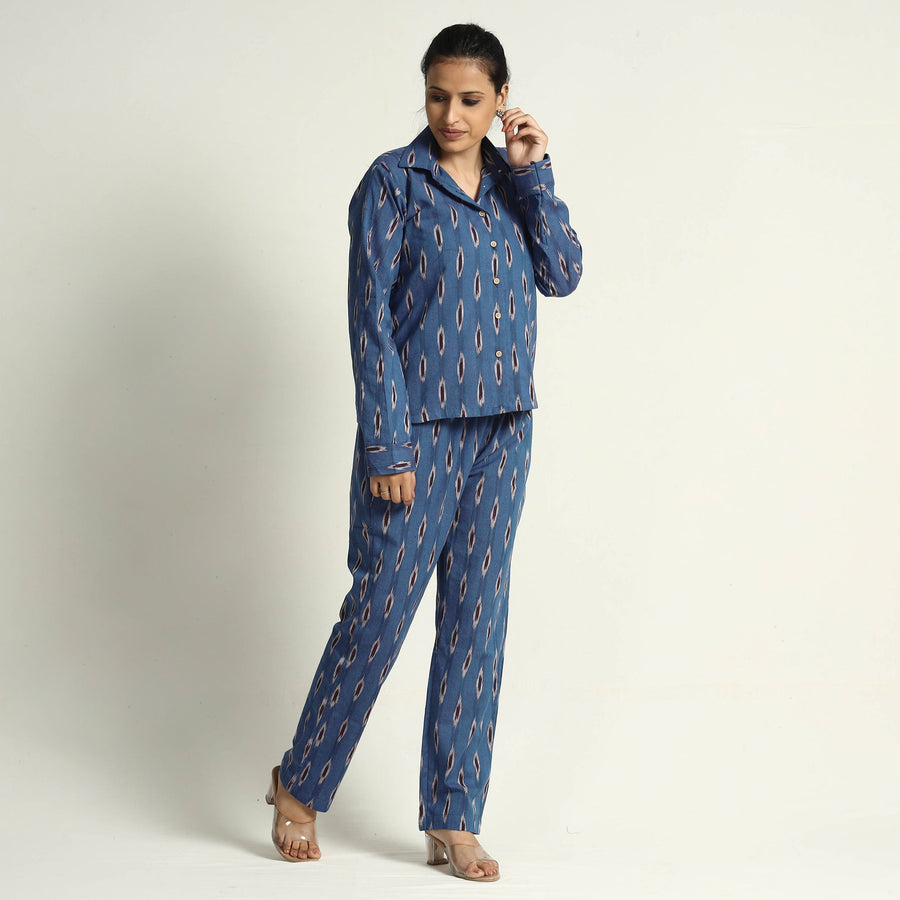 Stay comfortable and stylish in this cotton two-piece Co-ord set. The set features an elasticated pant and a regular collared top with a wooden button placket. Crafted from pochampally ikat-weave cotton fabric, this two-piece Co-ord set offers comfort and breathability. The soft elasticized waist pant ensures a great fit, while the two side pockets add functionality. The unique design ensures a beautiful and comfortable fit. Stay relaxed and chic all day long in this stunning co-ord set that is perfect for any occasion.