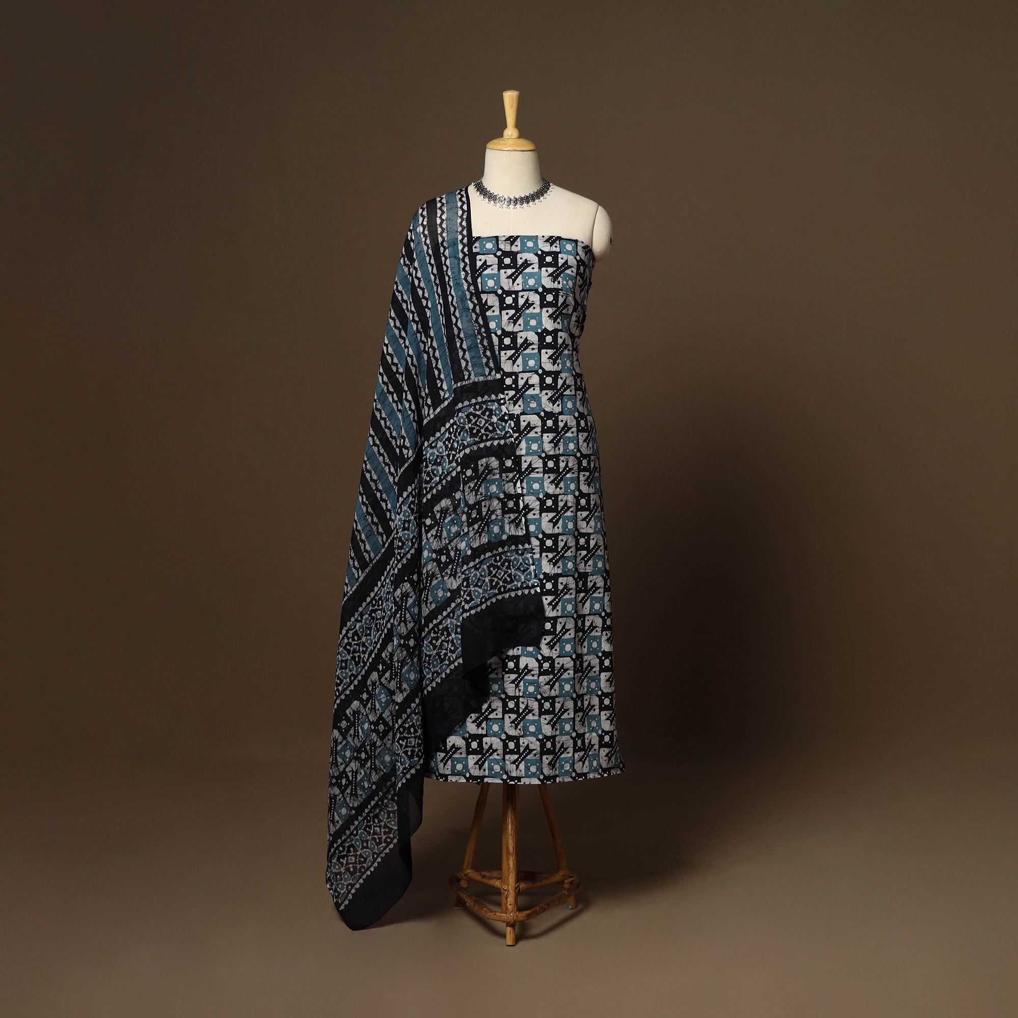 This blue 3pc cotton kutch batik print dress material, crafted in Kutch using traditional wax-resist dyeing techniques. Batik offers both durability and comfort, making it a perfect choice for everyday or festive wear. The vibrant colors and intricate designs make this set a statement piece.