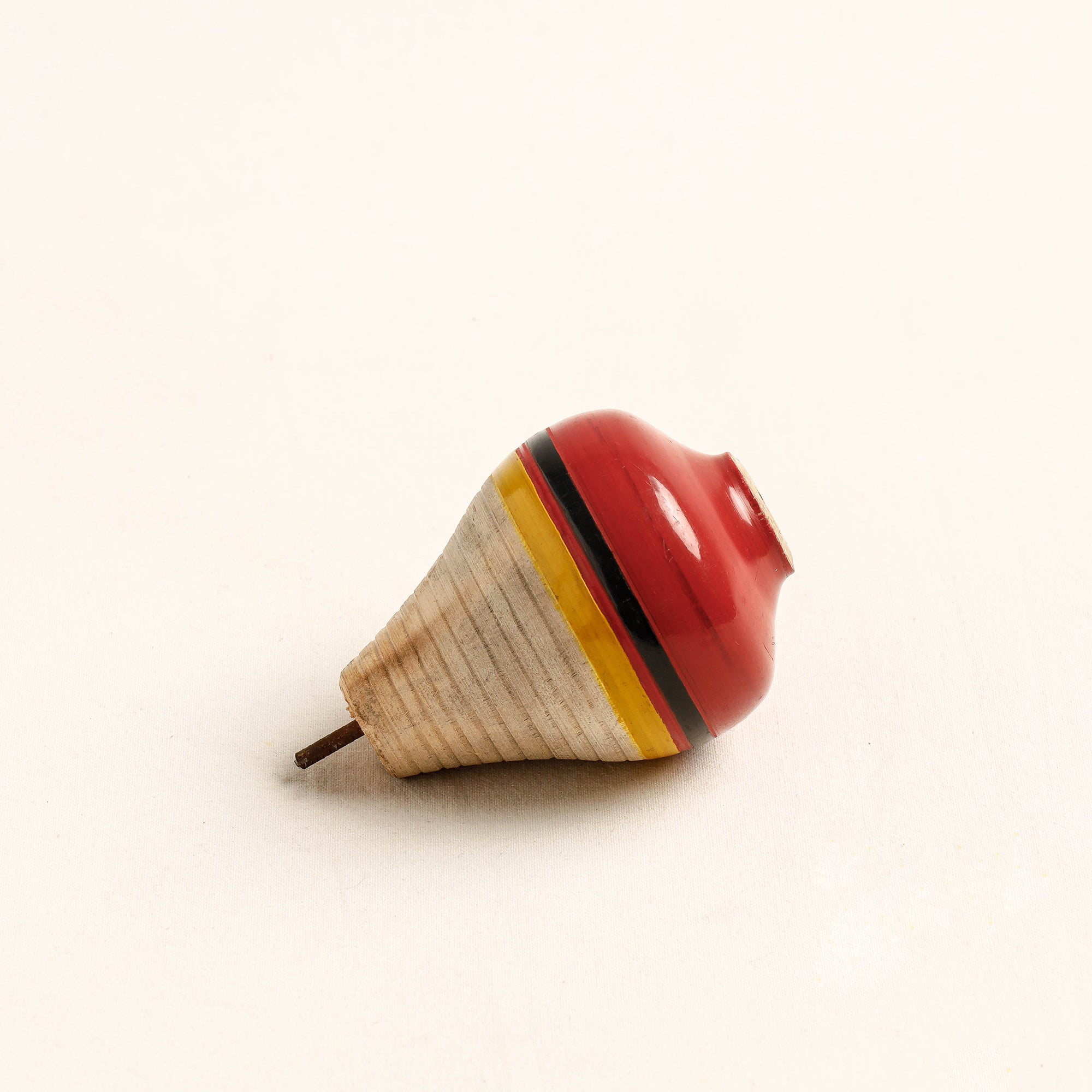 This handcrafted wooden spinning top - lattu is made of babool wood with lacquered colours. This lattu meticulously handcrafted by skilled artisans from the Vadha community in villages like Nirona and Jura. They begin by selecting babool wood, which is known for its durability and strength. Layers of coloured lacquer are applied to the wood, and intricate designs and effects are chiselled to create a stunning visual appeal.