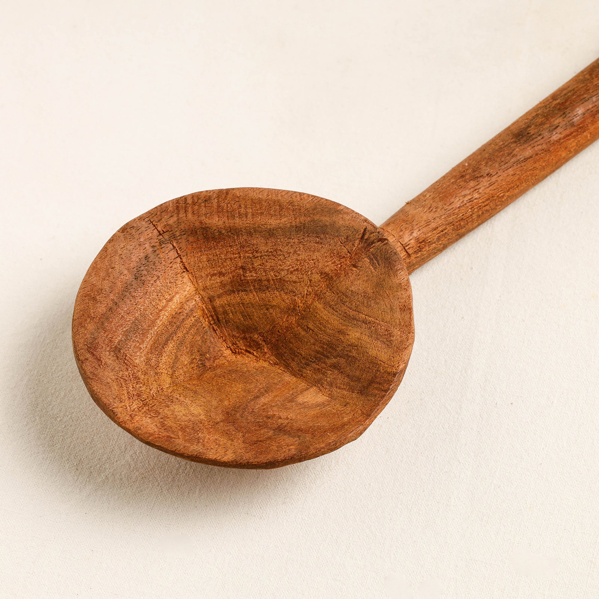 This exquisitely handcrafted ladle spoon made of babool wood with lacquered colours. This ladle spoon is meticulously handcrafted by skilled artisans from the Vadha community in villages like Nirona and Jura. They begin by selecting babool wood, which is known for its durability and strength. Layers of coloured lacquer are applied to the wood, and intricate designs and effects are chiselled to create a stunning visual appeal.