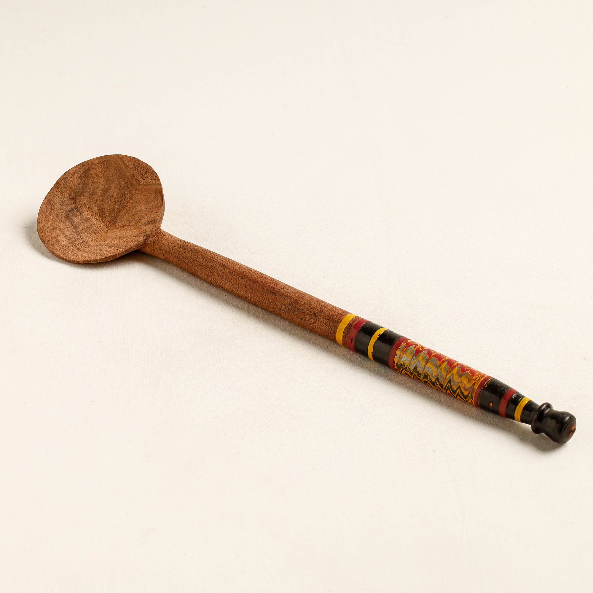 This exquisitely handcrafted ladle spoon made of babool wood with lacquered colours. This ladle spoon is meticulously handcrafted by skilled artisans from the Vadha community in villages like Nirona and Jura. They begin by selecting babool wood, which is known for its durability and strength. Layers of coloured lacquer are applied to the wood, and intricate designs and effects are chiselled to create a stunning visual appeal.