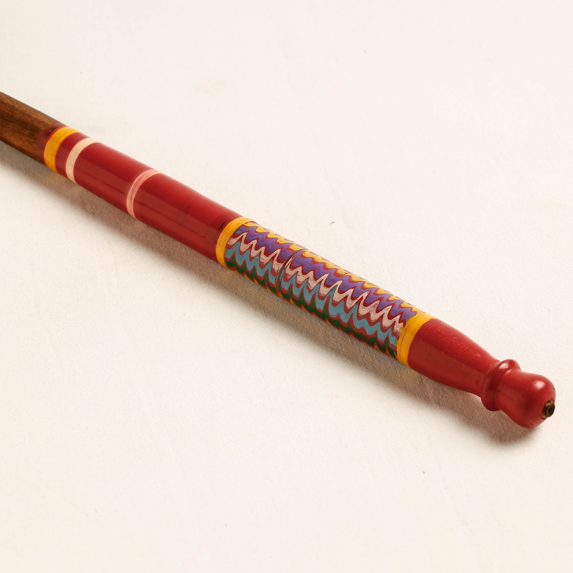 This exquisitely handcrafted ladle spoon made of babool wood with lacquered colours. This ladle spoon is meticulously handcrafted by skilled artisans from the Vadha community in villages like Nirona and Jura. They begin by selecting babool wood, which is known for its durability and strength. Layers of coloured lacquer are applied to the wood, and intricate designs and effects are chiselled to create a stunning visual appeal.