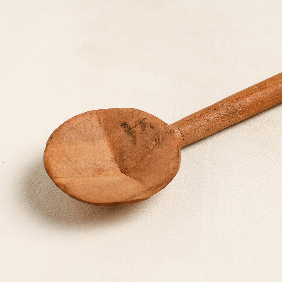 This exquisitely handcrafted ladle spoon made of babool wood with lacquered colours. This ladle spoon is meticulously handcrafted by skilled artisans from the Vadha community in villages like Nirona and Jura. They begin by selecting babool wood, which is known for its durability and strength. Layers of coloured lacquer are applied to the wood, and intricate designs and effects are chiselled to create a stunning visual appeal.