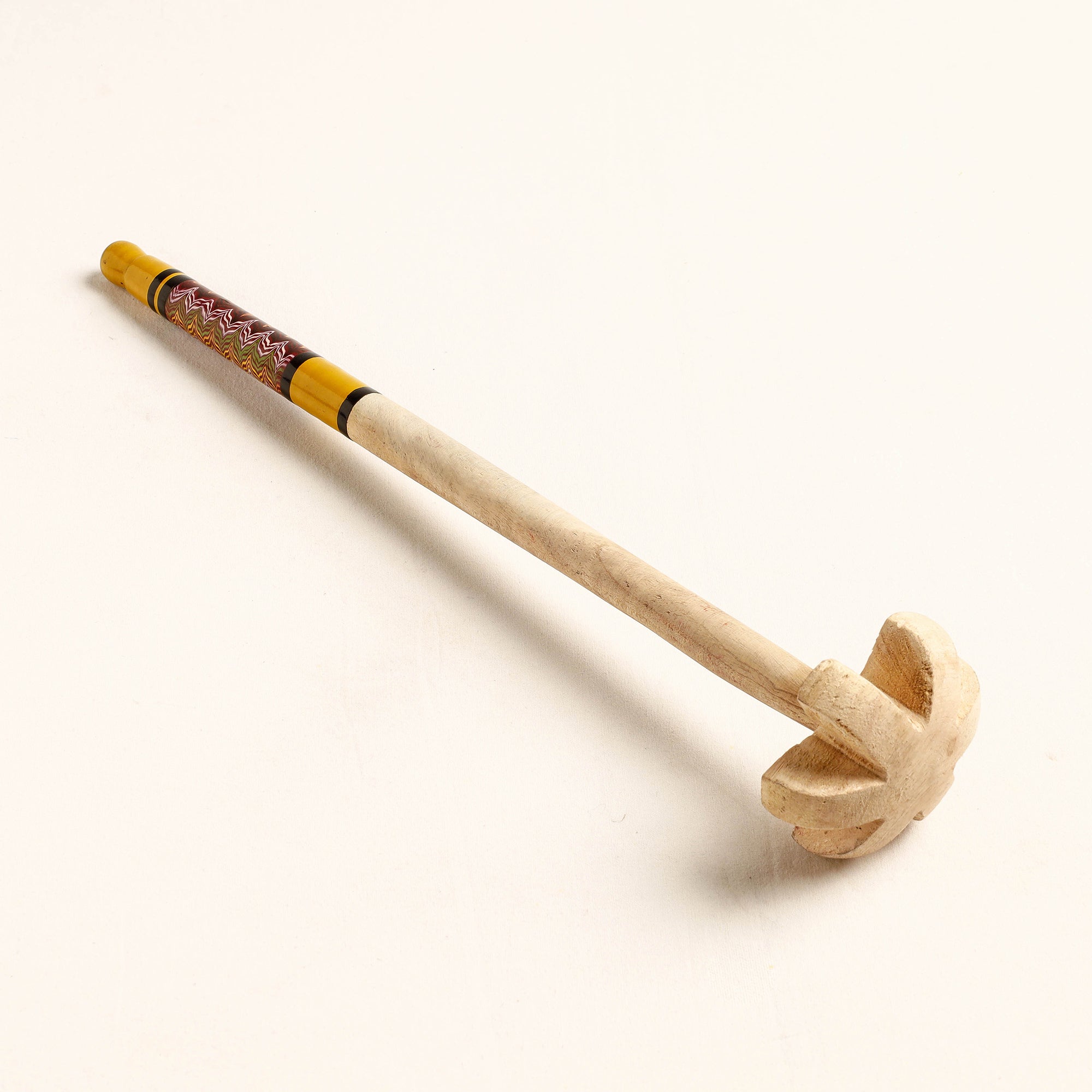 This exquisitely handcrafted hand blender/mathani rai is made of babool wood with lacquered colours. This mathani rai is meticulously handcrafted by skilled artisans from the Vadha community in villages like Nirona and Jura. They begin by selecting babool wood, which is known for its durability and strength. Layers of coloured lacquer are applied to the wood, and intricate designs and effects are chiselled to create a stunning visual appeal.