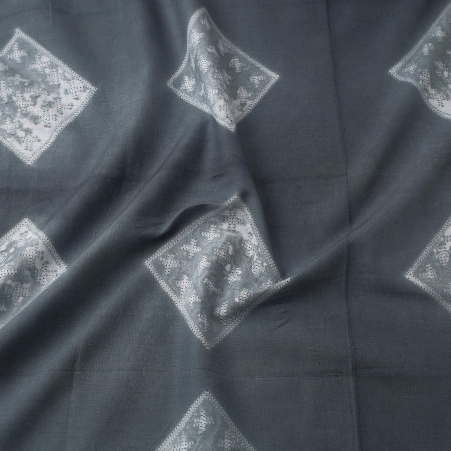 Fine quality grey nui shibori tie-dye cotton fabric. This exquisite fabric is crafted from pure cotton, ensuring a soft and breathable texture. Nui shibori includes stitched shibori. A simple running stitch is used on the cloth, then pulled tight to gather the cloth. Each thread is secured by knotting before being dyed. This technique allows for greater control of the pattern and a greater variety of patterns, but it is much more time-consuming. This fabric is ideal for creating vibrant apparel, home textiles, and accessories with a touch of Andhra Pradesh's traditional artistry.