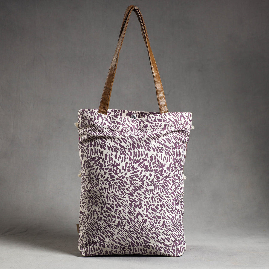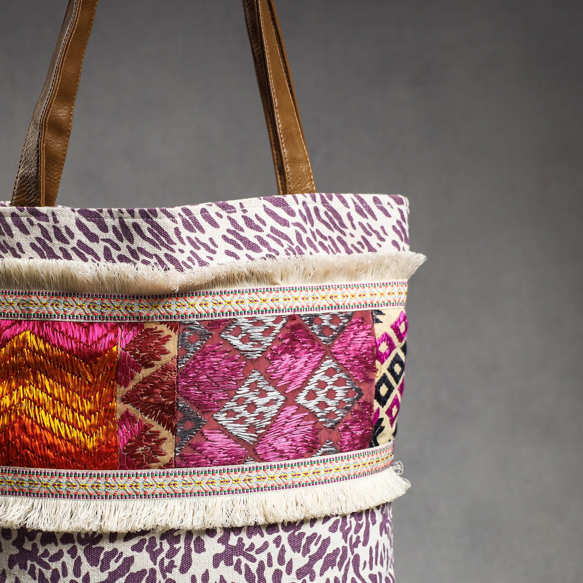 Purple handcrafted phulkari embroidery canvas cotton tote bag with artificial leather handles, made from thick and durable printed canvas cotton fabric. It is lined with printed cotton fabric inside. Interior zipper pocket for secure organization. It has ample space to keep most of your essentials.
