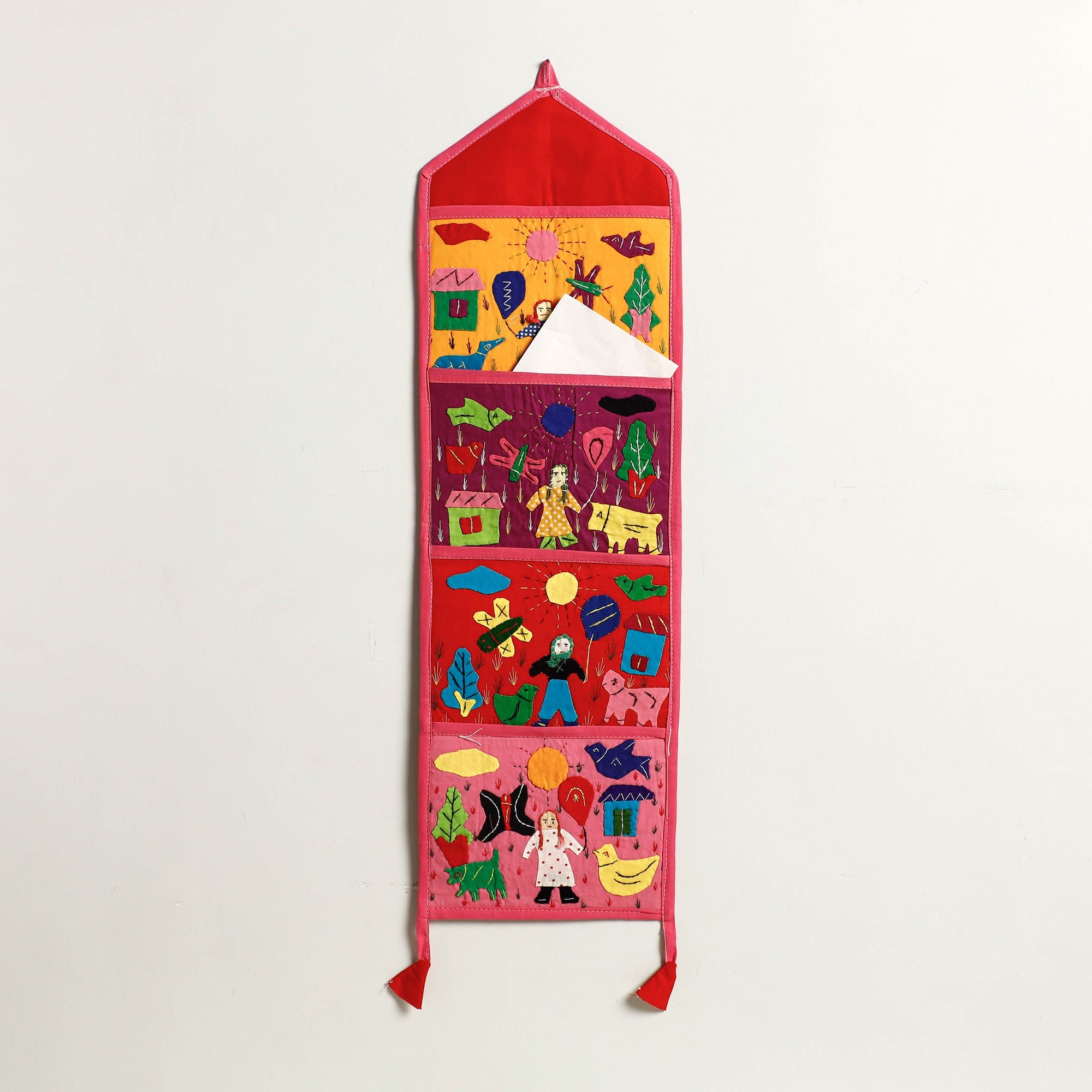 Tribal design hand-stitched pipli applique work wall hanging with four utility pockets made from pure cotton fabrics handcrafted by artisans of Pipili, the hub of traditional art and craft in Odisha.