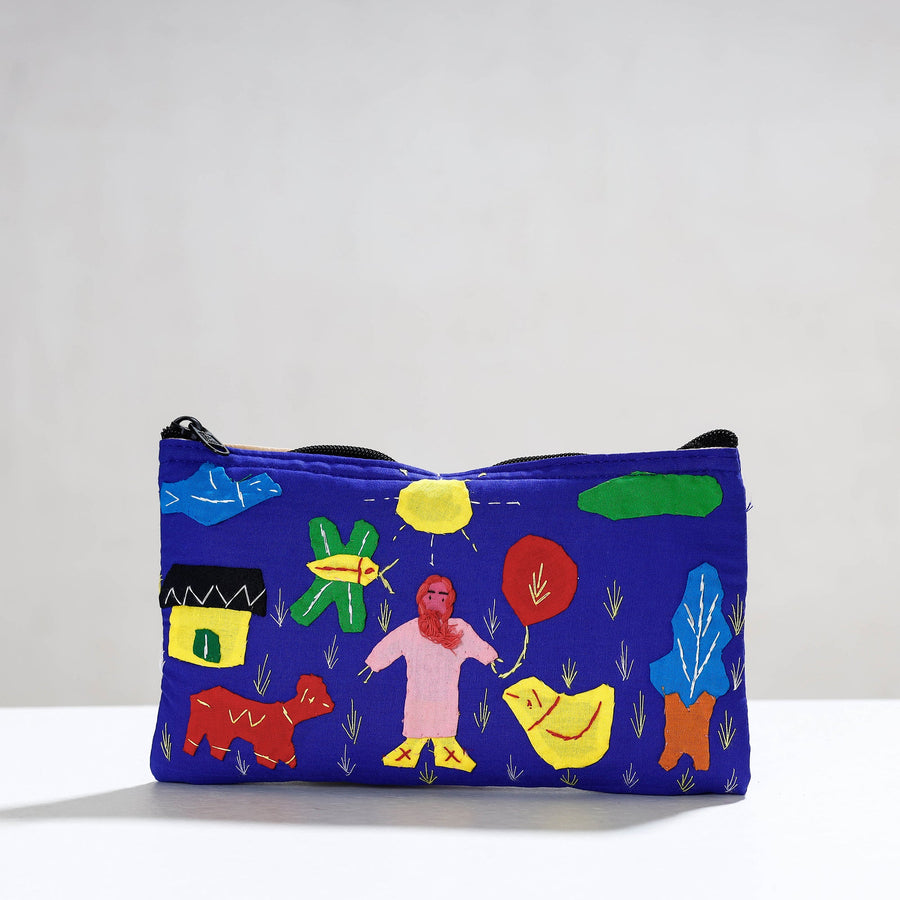 Tribal design hand stitched pipli applique work cosmetic pouch made from mix cotton fabrics & soft foam filling inside handcrafted by artisans of Pipili, the hub of traditional art & craft in Odisha. Useful for general cosmetic or toiletry products. (has no pockets) Applique work is a traditional patchwork that has a long history in Odisha. This applique work is normally dependent on some bright colours that is red, white, black, yellow, green and blue etc. The artisans skillfully stitch the traditional motifs like animals, birds and flowers on fabric. Modern applique art form mainly inspired by the religious in nature and it is closely connected with religious traditions.