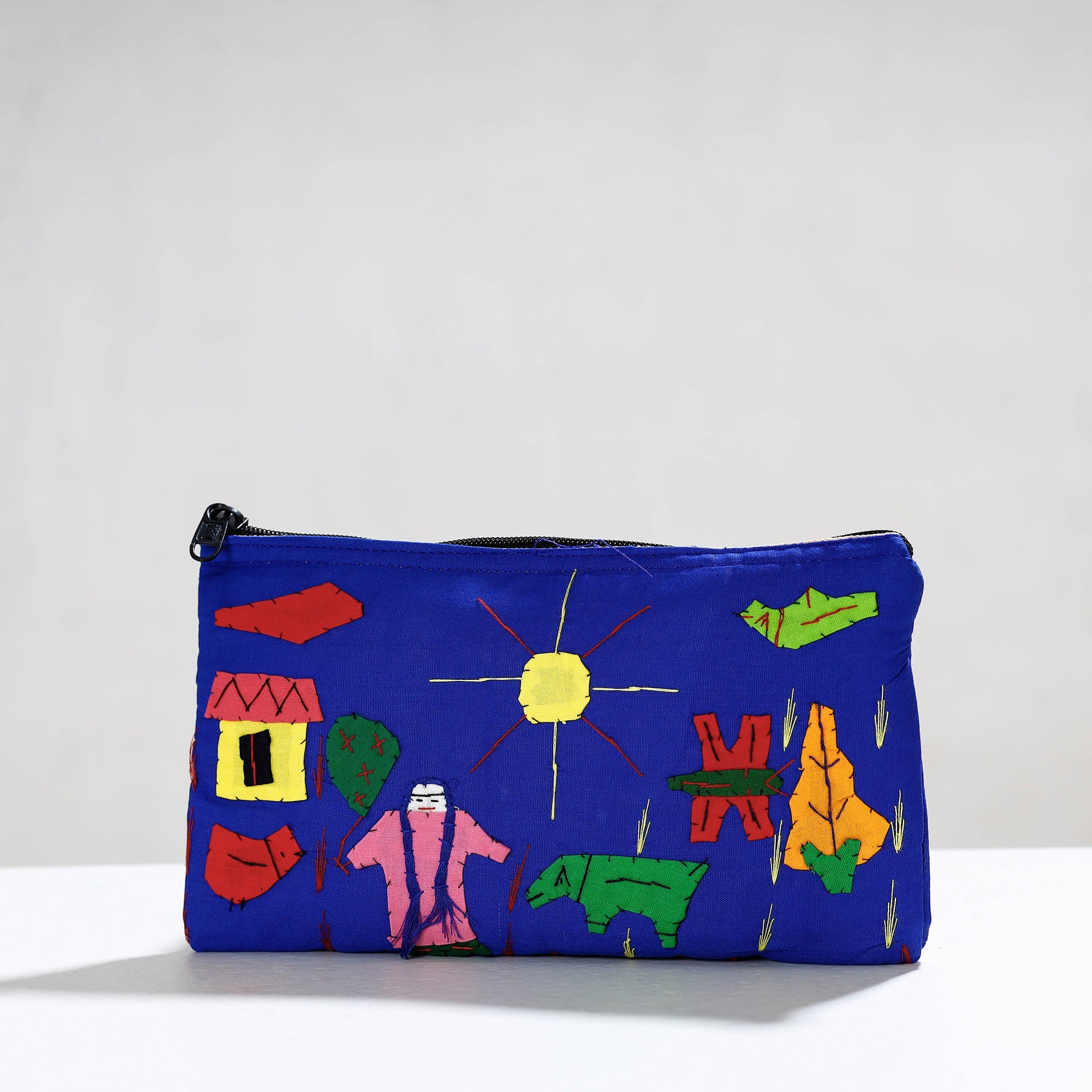 Tribal design hand stitched pipli applique work cosmetic pouch made from mix cotton fabrics & soft foam filling inside handcrafted by artisans of Pipili, the hub of traditional art & craft in Odisha. Useful for general cosmetic or toiletry products. (has no pockets) Applique work is a traditional patchwork that has a long history in Odisha. This applique work is normally dependent on some bright colours that is red, white, black, yellow, green and blue etc. The artisans skillfully stitch the traditional motifs like animals, birds and flowers on fabric. Modern applique art form mainly inspired by the religious in nature and it is closely connected with religious traditions.