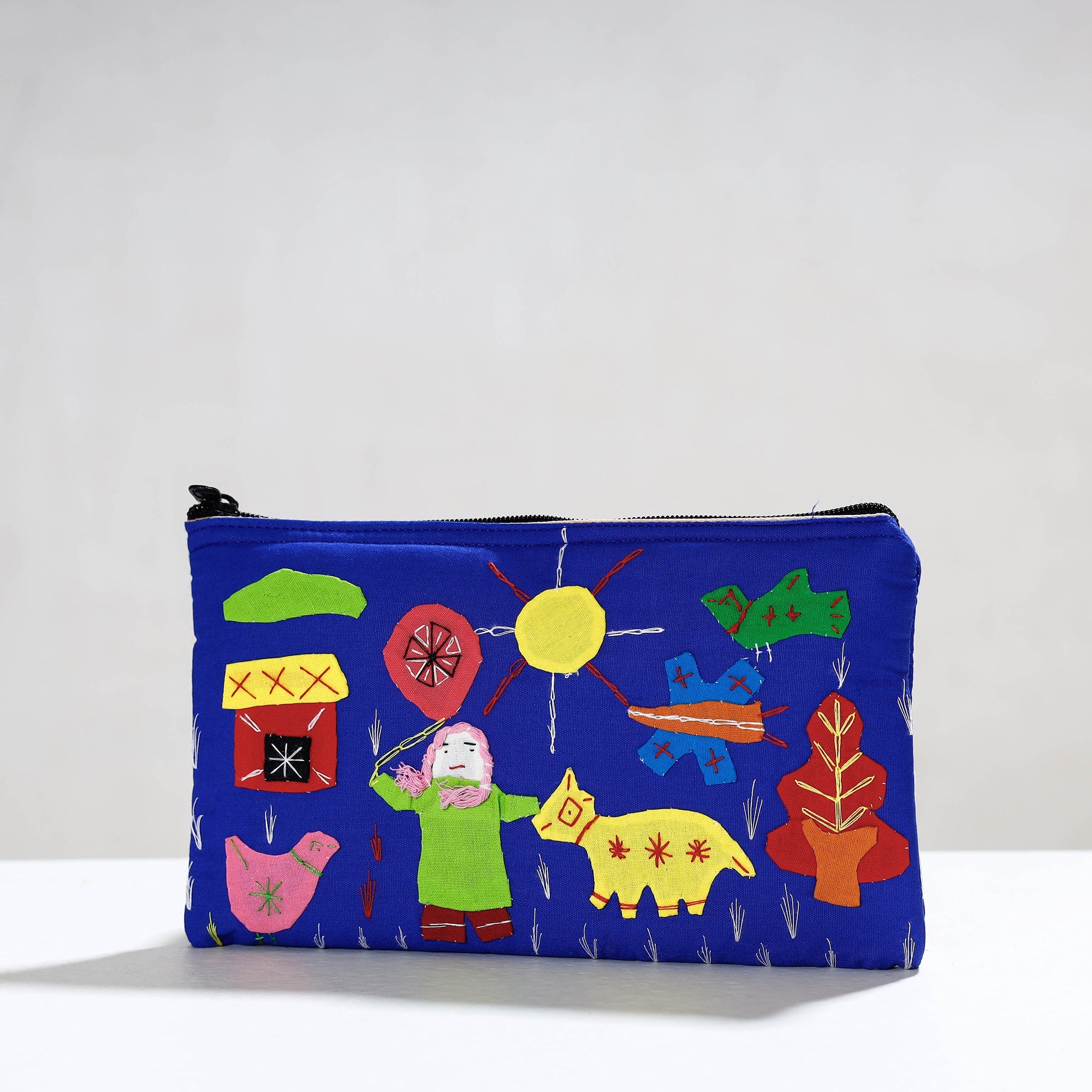 Tribal design hand stitched pipli applique work cosmetic pouch made from mix cotton fabrics & soft foam filling inside handcrafted by artisans of Pipili, the hub of traditional art & craft in Odisha. Useful for general cosmetic or toiletry products. (has no pockets) Applique work is a traditional patchwork that has a long history in Odisha. This applique work is normally dependent on some bright colours that is red, white, black, yellow, green and blue etc. The artisans skillfully stitch the traditional motifs like animals, birds and flowers on fabric. Modern applique art form mainly inspired by the religious in nature and it is closely connected with religious traditions.
