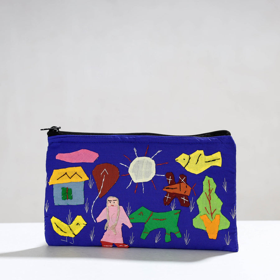 Tribal design hand stitched pipli applique work cosmetic pouch made from mix cotton fabrics & soft foam filling inside handcrafted by artisans of Pipili, the hub of traditional art & craft in Odisha. Useful for general cosmetic or toiletry products. (has no pockets) Applique work is a traditional patchwork that has a long history in Odisha. This applique work is normally dependent on some bright colours that is red, white, black, yellow, green and blue etc. The artisans skillfully stitch the traditional motifs like animals, birds and flowers on fabric. Modern applique art form mainly inspired by the religious in nature and it is closely connected with religious traditions.