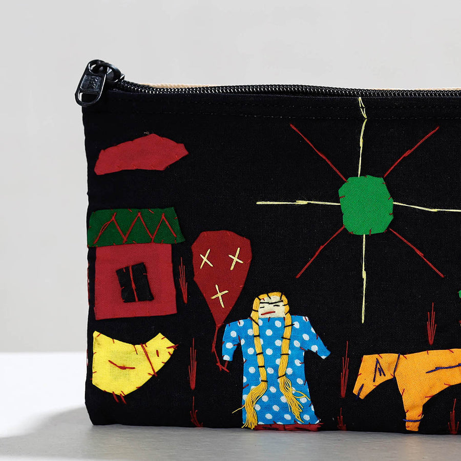 Tribal design hand stitched pipli applique work cosmetic pouch made from mix cotton fabrics & soft foam filling inside handcrafted by artisans of Pipili, the hub of traditional art & craft in Odisha. Useful for general cosmetic or toiletry products. (has no pockets) Applique work is a traditional patchwork that has a long history in Odisha. This applique work is normally dependent on some bright colours that is red, white, black, yellow, green and blue etc. The artisans skillfully stitch the traditional motifs like animals, birds and flowers on fabric. Modern applique art form mainly inspired by the religious in nature and it is closely connected with religious traditions.