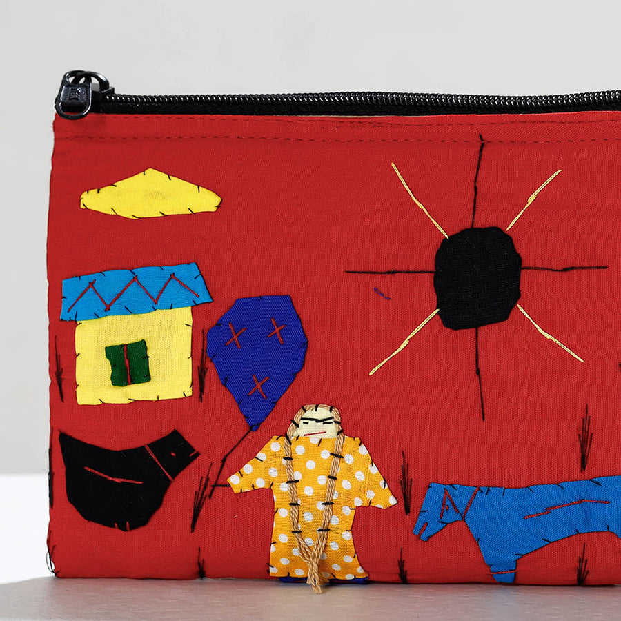 Tribal design hand stitched pipli applique work cosmetic pouch made from mix cotton fabrics & soft foam filling inside handcrafted by artisans of Pipili, the hub of traditional art & craft in Odisha. Useful for general cosmetic or toiletry products. (has no pockets) Applique work is a traditional patchwork that has a long history in Odisha. This applique work is normally dependent on some bright colours that is red, white, black, yellow, green and blue etc. The artisans skillfully stitch the traditional motifs like animals, birds and flowers on fabric. Modern applique art form mainly inspired by the religious in nature and it is closely connected with religious traditions.