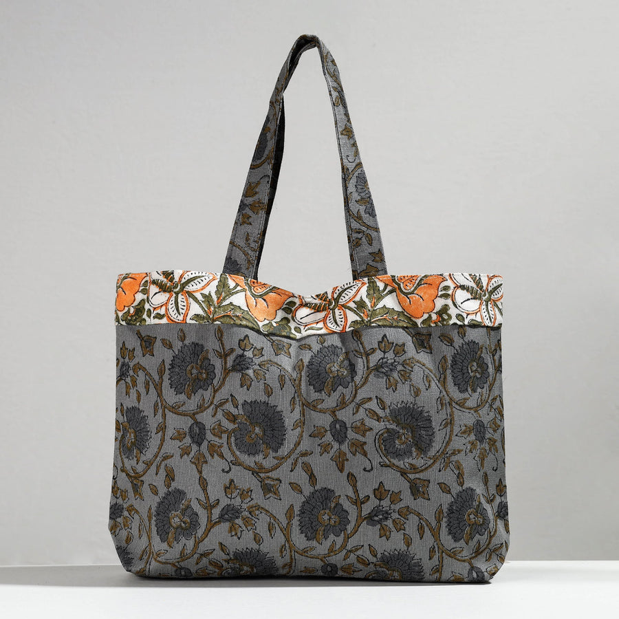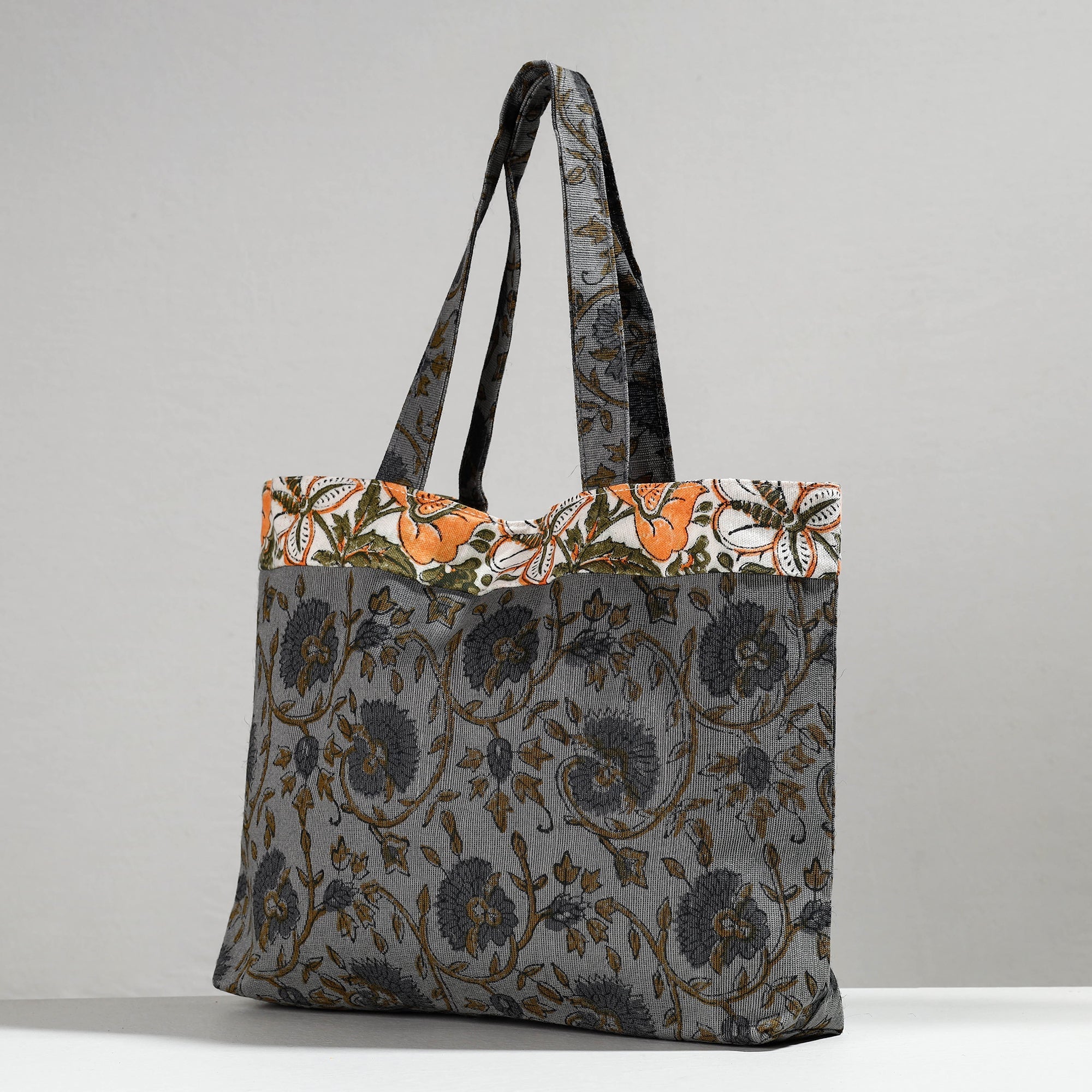 Grey handcrafted block printed shoulder bag made from laminated jute. It has one zipper pocket & one simple pocket inside. Ample space to keep most of your essentials.