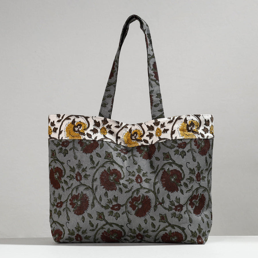 Grey handcrafted block printed shoulder bag made from laminated jute. It has one zipper pocket & one simple pocket inside. Ample space to keep most of your essentials.