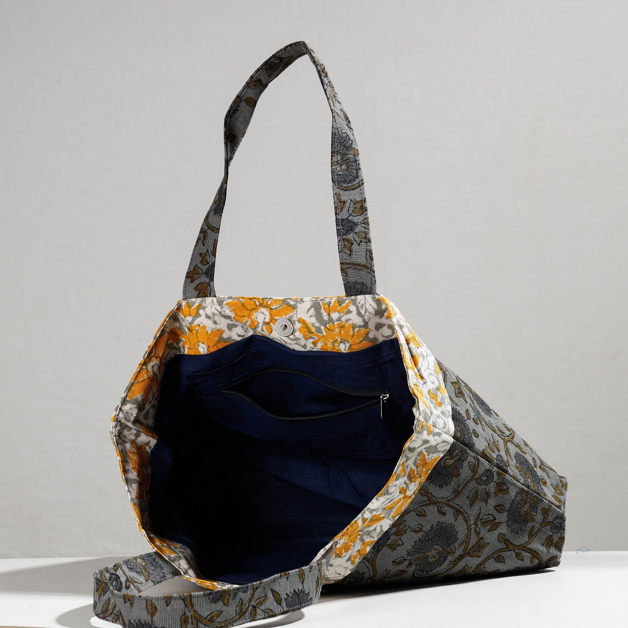 Grey handcrafted block printed shoulder bag made from laminated jute. It has one zipper pocket & one simple pocket inside. Ample space to keep most of your essentials.