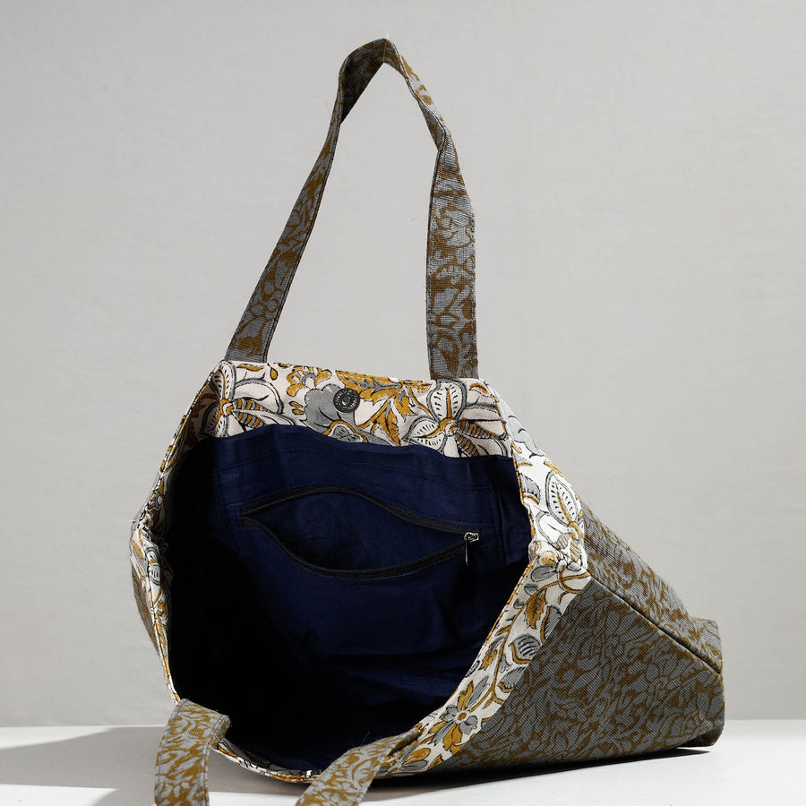 Grey handcrafted block printed shoulder bag made from laminated jute. It has one zipper pocket & one simple pocket inside. Ample space to keep most of your essentials.