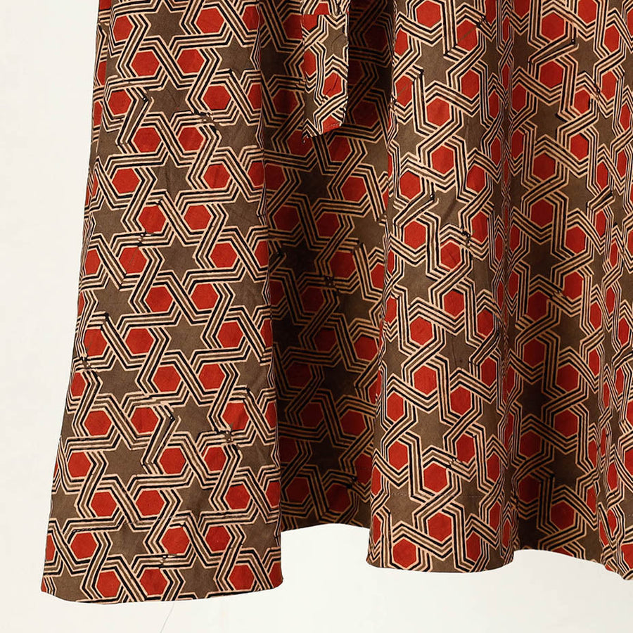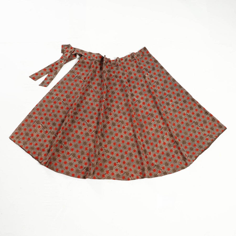 Fine quality brown ajrakh hand block printed cotton wrap around skirt featuring a waist tie up closure, made using natural dyes through traditional ajrakh technique of hand-block printing practised by the master artisans in Kutch region of Gujarat.