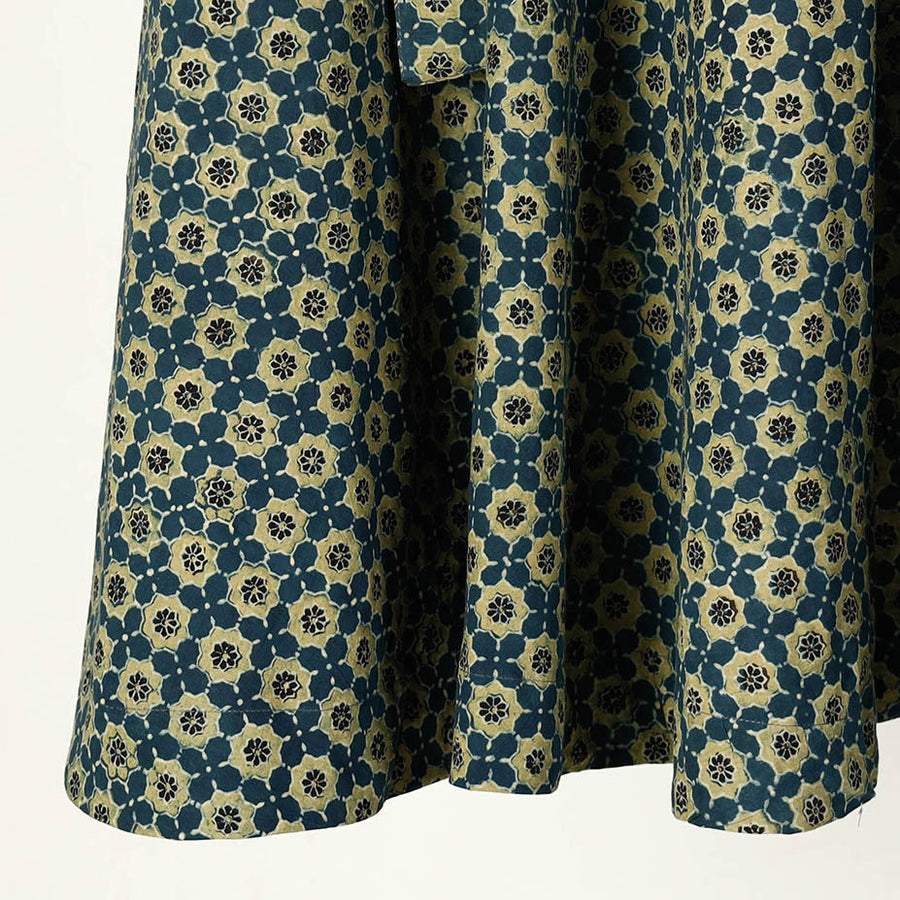 Fine quality blue ajrakh hand block printed cotton wrap around skirt featuring a waist tie up closure, made using natural dyes through traditional ajrakh technique of hand-block printing practised by the master artisans in Kutch region of Gujarat.