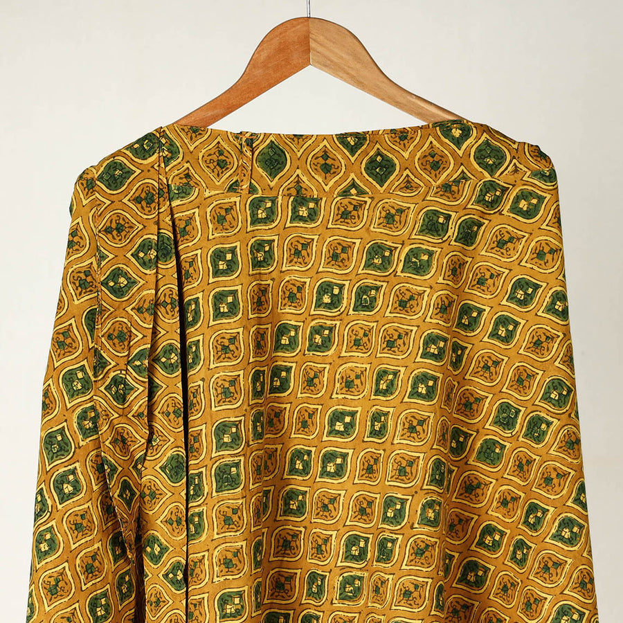 Fine quality yellow ajrakh hand block printed cotton wrap around skirt featuring a waist tie up closure, made using natural dyes through traditional ajrakh technique of hand-block printing practised by the master artisans in Kutch region of Gujarat.