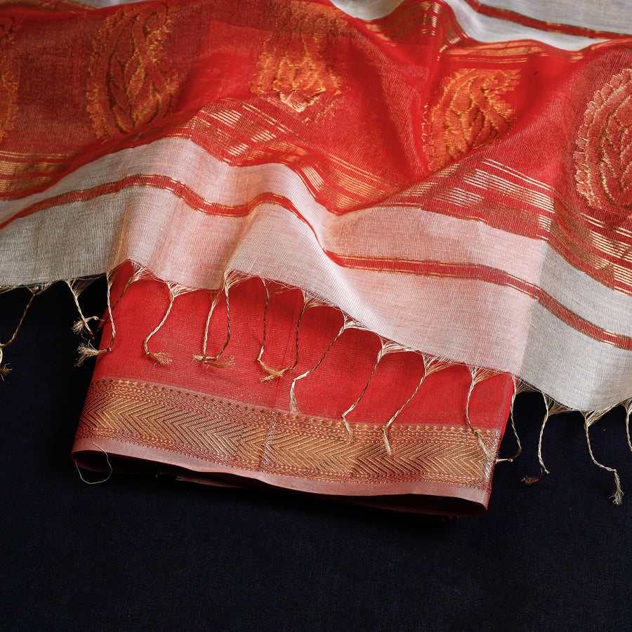 Fine quality traditional maheshwari silk-cotton handloom 3pc suit material set with intricate woven zari work. Its lightweight and sheer texture giving an exquisite grace and elegance of its own. The weaving tradition has been practised in their family for many generations.