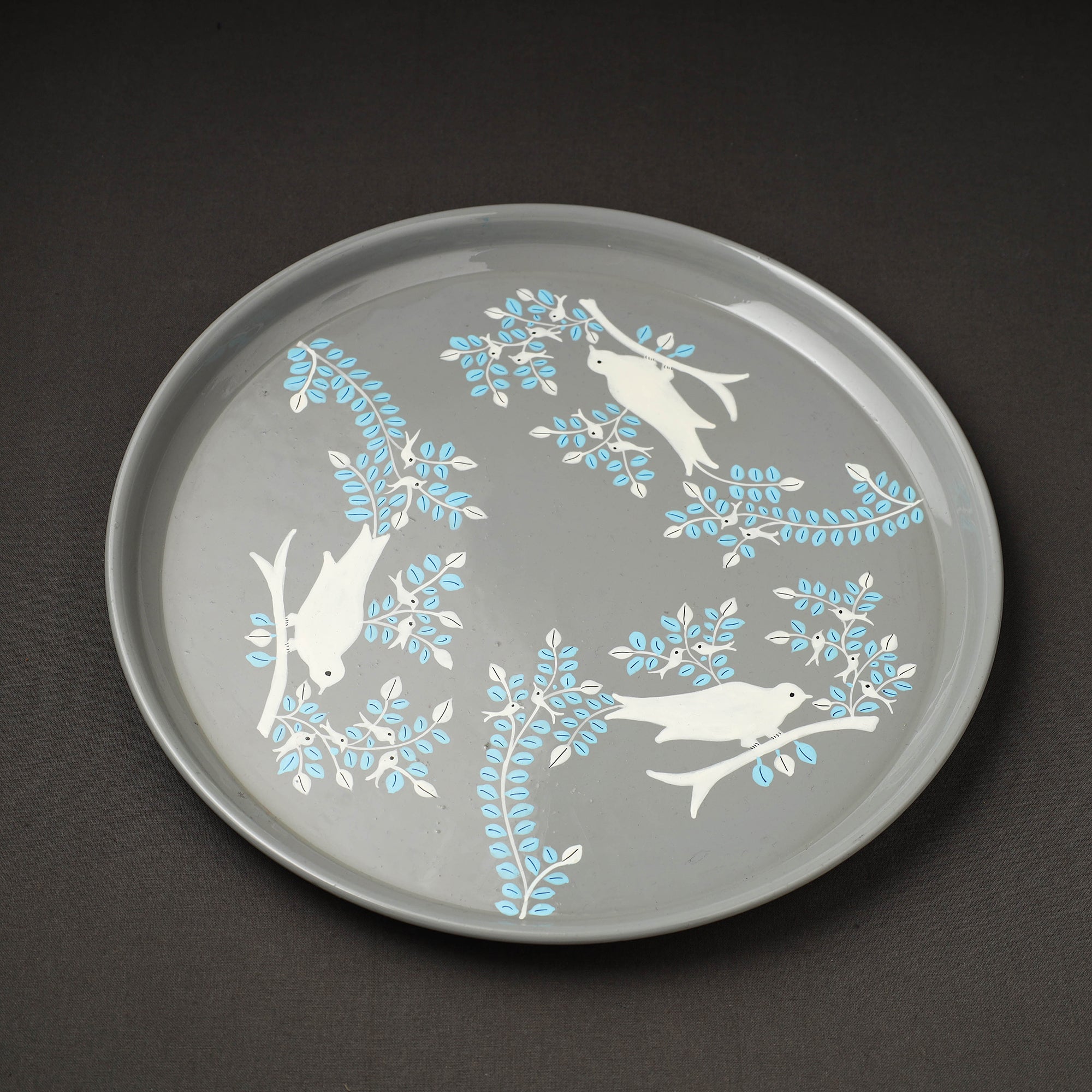 Floral design grey handpainted plate with waterproof oil-based paint on very high-quality stainless steel by the artisans of Kashmir.
