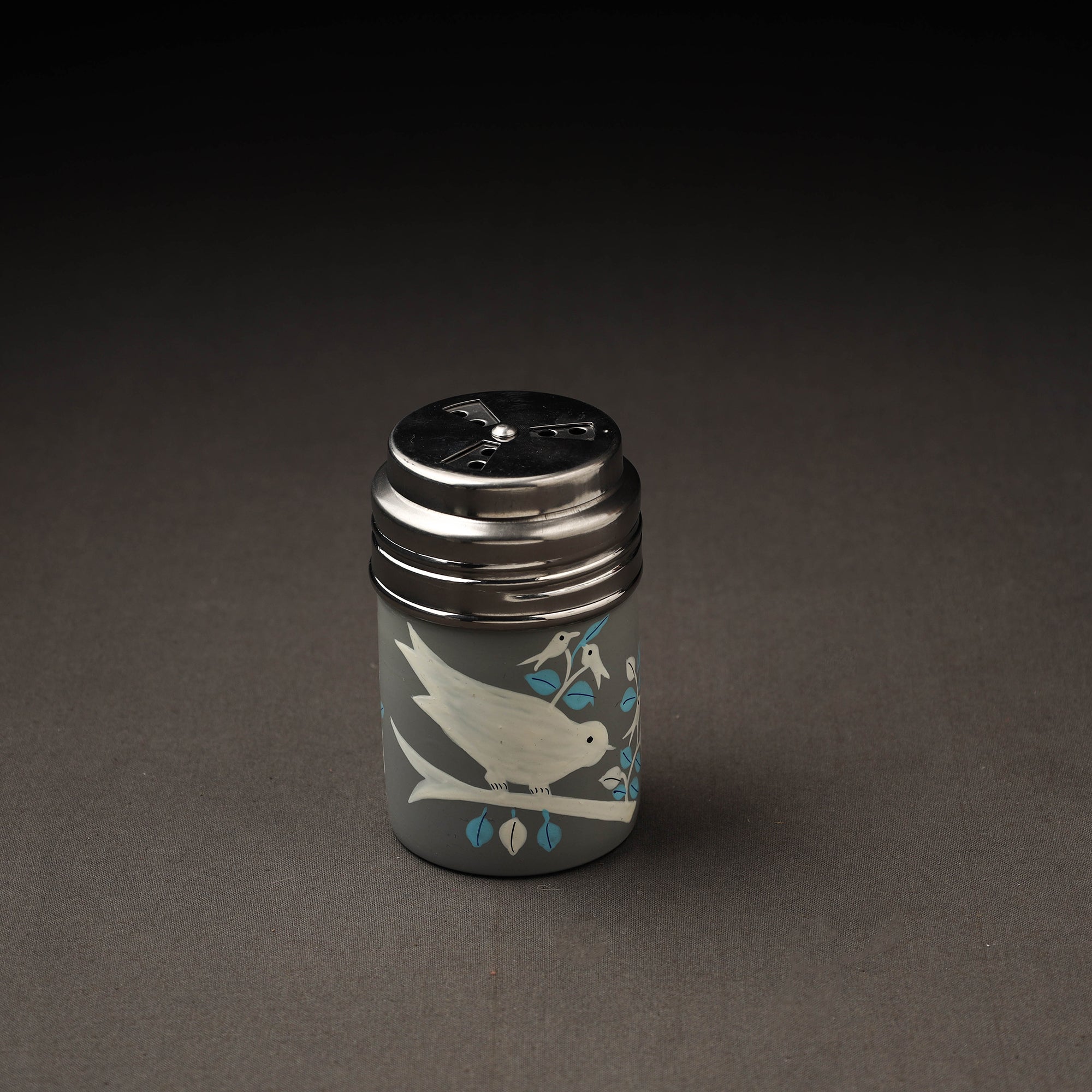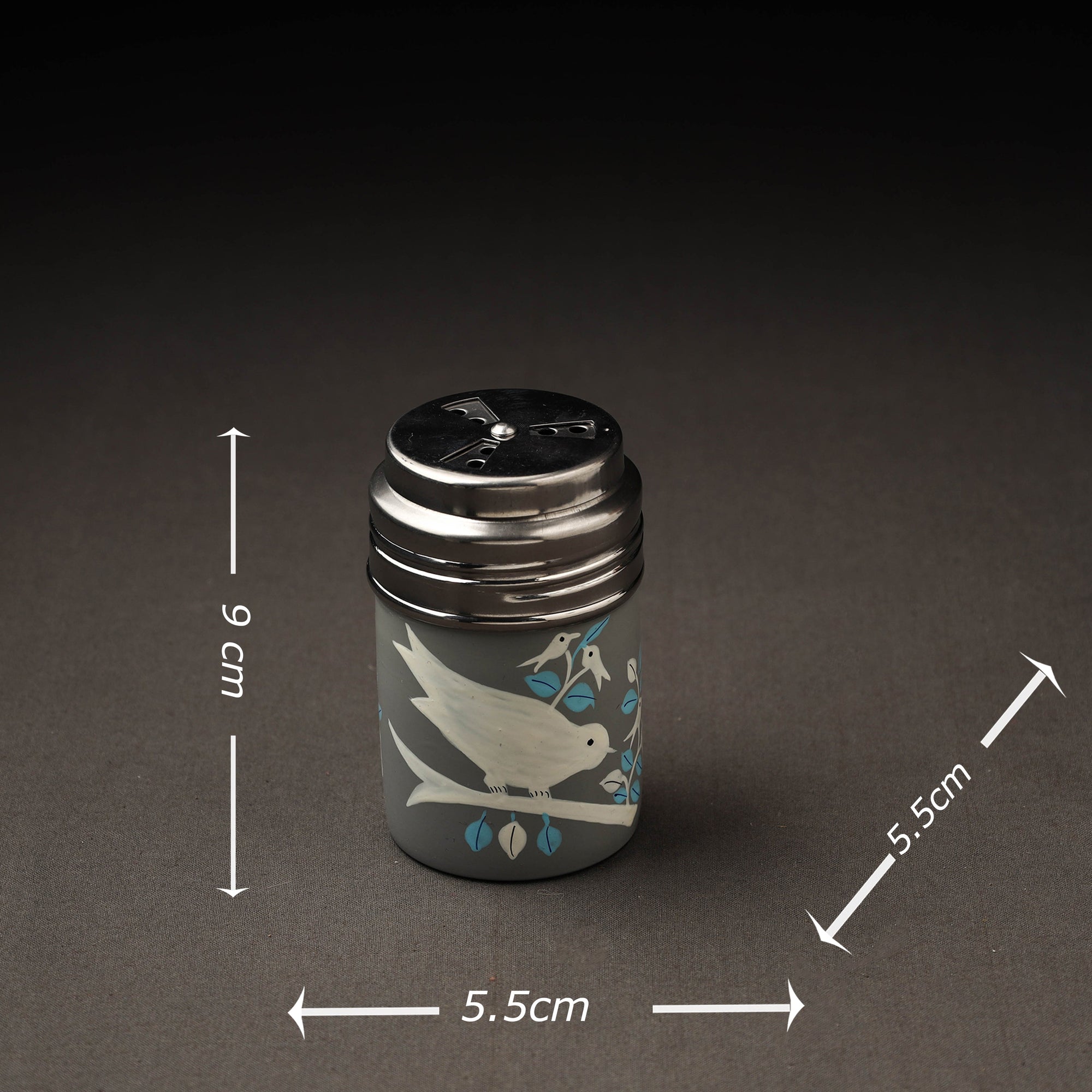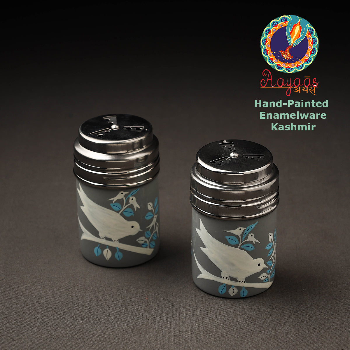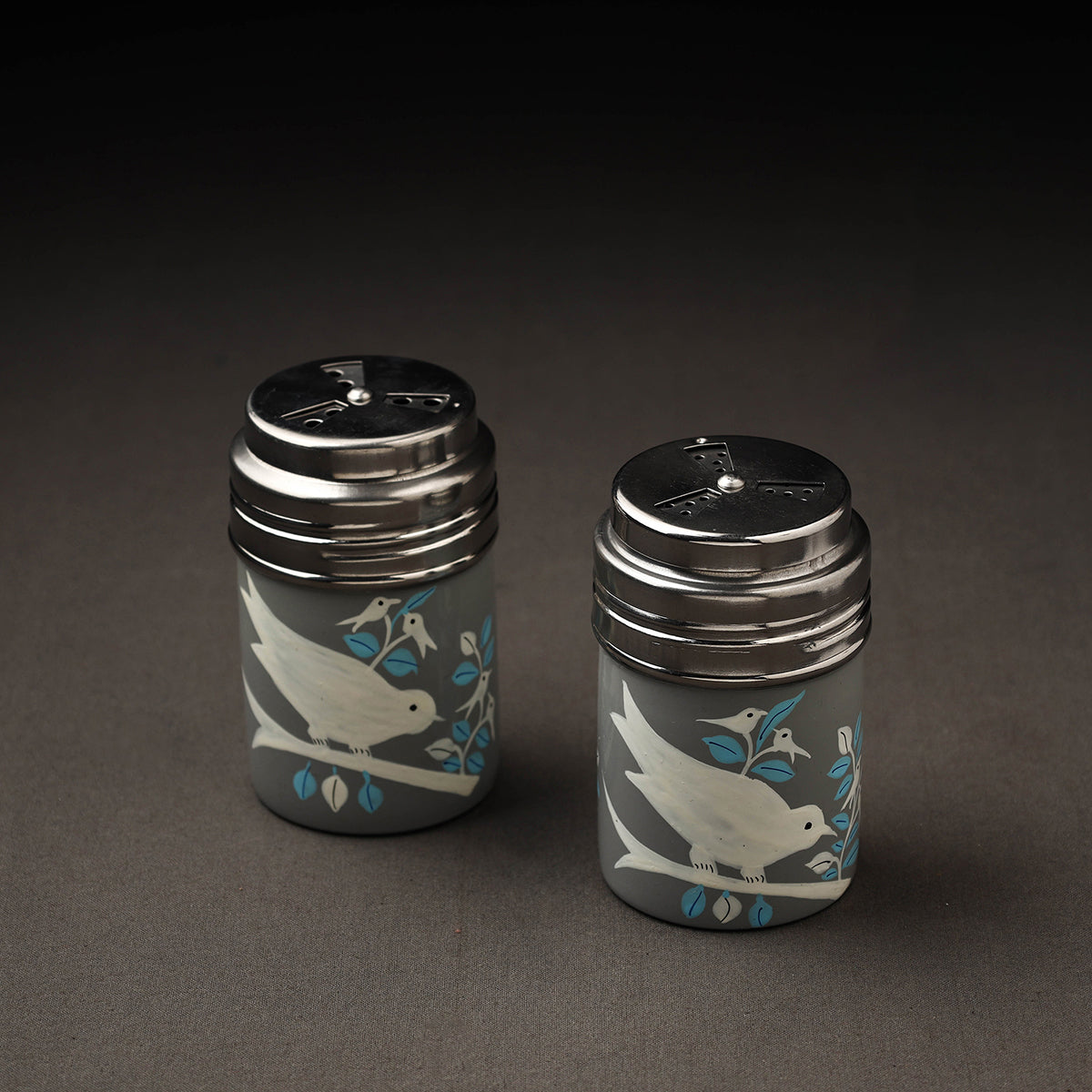 Floral design grey handpainted salt and pepper shaker with waterproof oil based paint on very high-quality stainless steel by the artisans of Kashmir. These handpainted salt and pepper shakers will surely look very classy on your dining table or your kitchen counter.