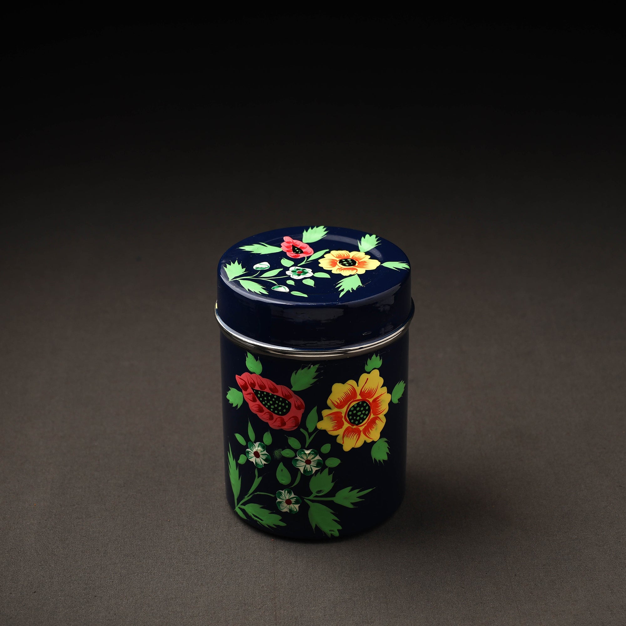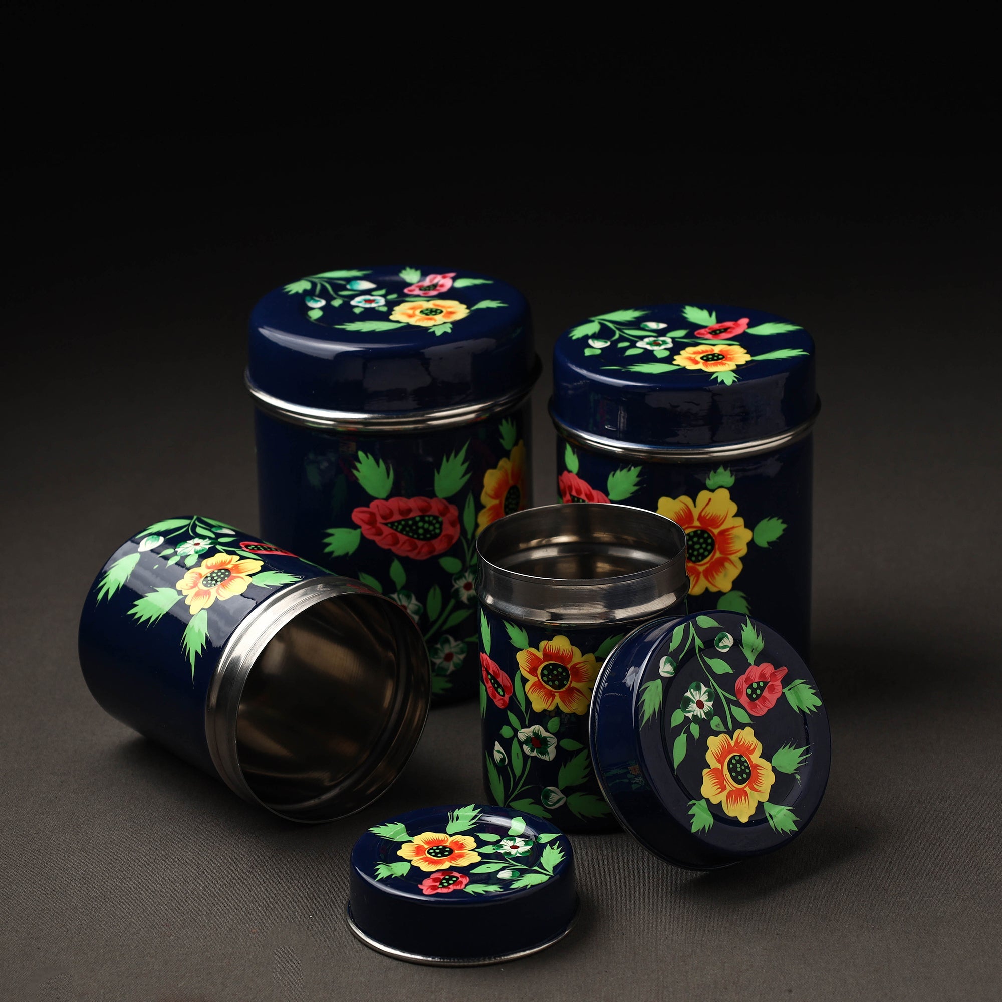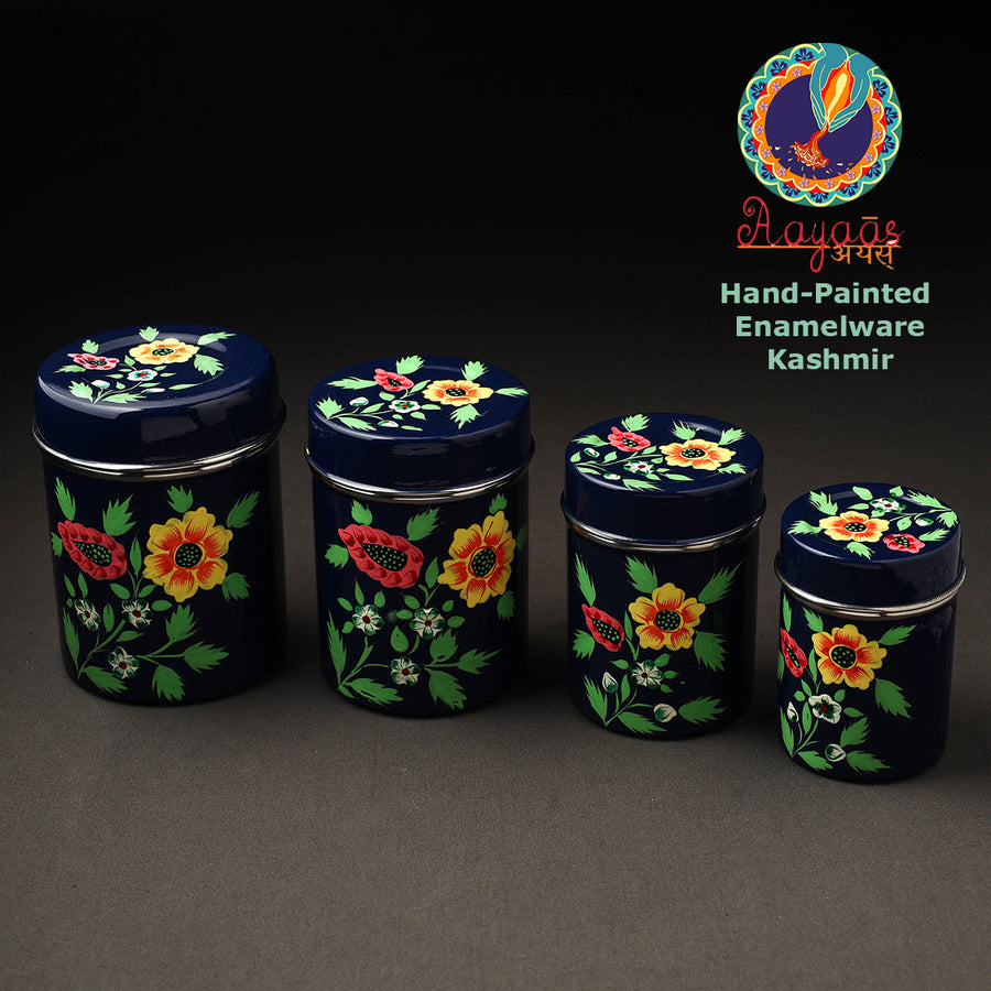 Floral design blue handpainted canisters with waterproof oil based paint on very high-quality stainless steel by the artisans of Kashmir. These canisters are used for storing tea, coffee, sugar, or anything else in the kitchen you need to keep the air tight.